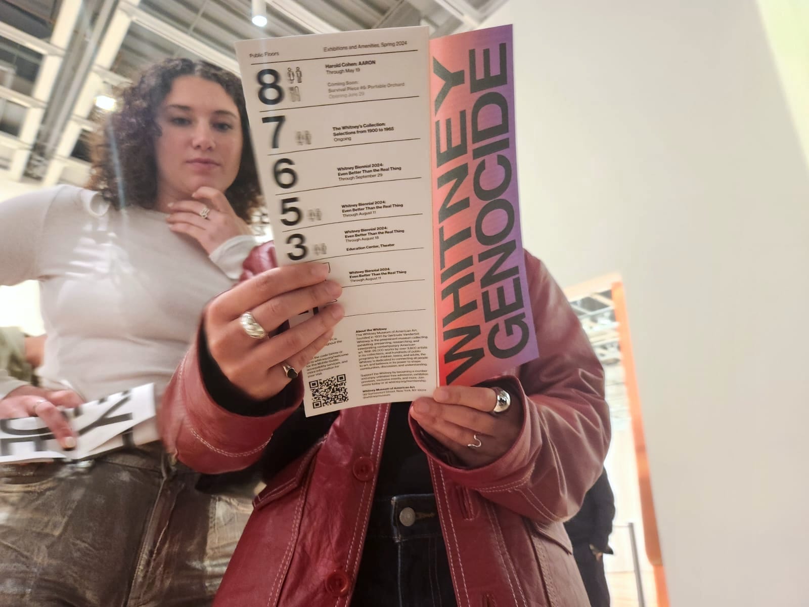 The fifth floor of the Whitney Museum of American Art in New York City became the site of an audiovisual demonstration by an anonymous group of pro-Palestine arts and culture workers yesterday evening, May 3. During the Whitney's "Free Friday Night" event, which offers pay-what you-wish admission between 7pm and 10pm, around 100 activists distributed custom-printed imitation brochures using the museum's stylized branding to draw attention to its funders and sponsors and their ties to "genocide and dispossession," including companies linked to Israel's ongoing attacks on Palestine.