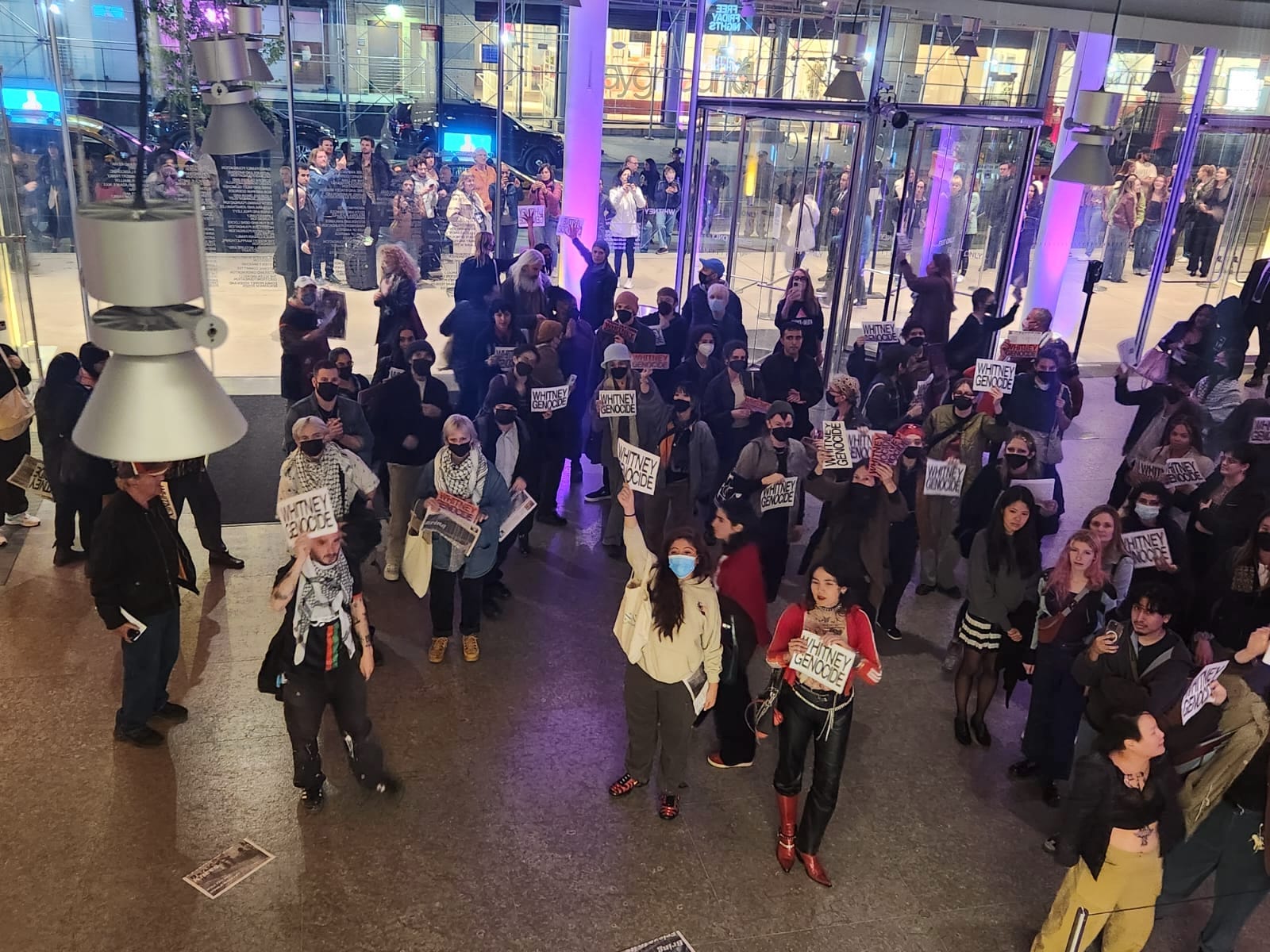 Approximately 100 activists overtook the museum on Friday night with video and sound interventions emphasizing the suffering of families in Gaza.