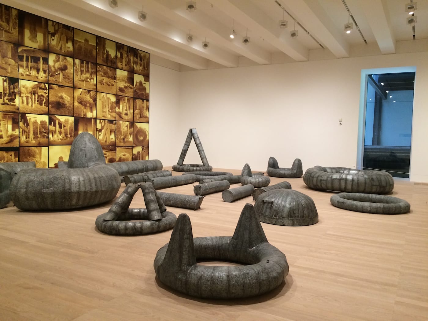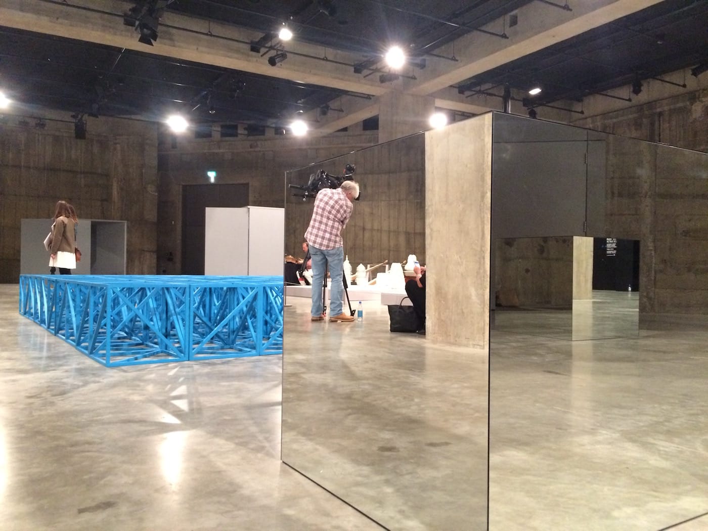 Upon proceeding to a room designated “Active Sculpture,” the chatter of journalists gave way to silence and then a plaintive sonic arrangement by Tarek Atoui. This 98-foot-wide chthonic cavity is a playground for aesthetes, with mirror cubes by Robert Morris (“Untitled,” 1965, reconstructed 1971), a configuration of sky-blue lattice-construction cubes from Rasheed Araeen (“Zero to Infinity,” 1968-2007) and a semi-enclosed booth by Charlotte Posenenske that affords a moment of privacy before snatching it away (“Concept Revolving Vanes / Mobile Walls,” 1967/68, replicas 2016).