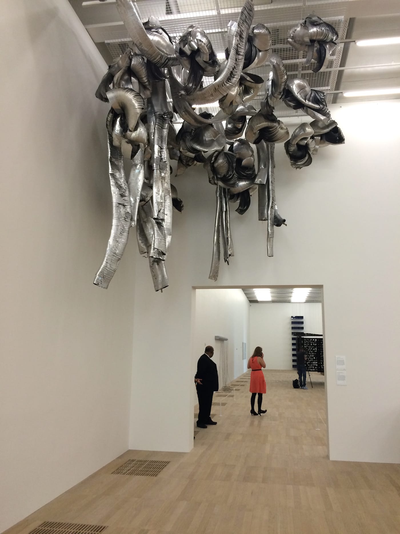 The second level of Switch House is home to a four-ton cube of pink glass by Roni Horn, (“Pink Tons,” 2009), a silent bubble fountain by David Medalla (“Cloud Canyons No. 3: An Ensemble of Bubble Machines [Auto Creative Sculptures],” 1961, remade 2004), and swags of aluminum bunting by Marisa Merz (“Untitled [Living Sculpture],” 1966). From there, it is on to level three, where Hélio Oiticica has staged a Brazilian favela complete with sand, tropical plants, and squawking macaws (“Tropicália,” 1966–1967). On the fourth floor, the stuffed cadavers of Louise Bourgeois are suspended next to the Tolkien-esque metallic spiders that are her signature creation. Each floor, each room, is a revelation, a testament to artistic ingenuity, an intoxicating spectacle that brings together half of a century of formal innovation.