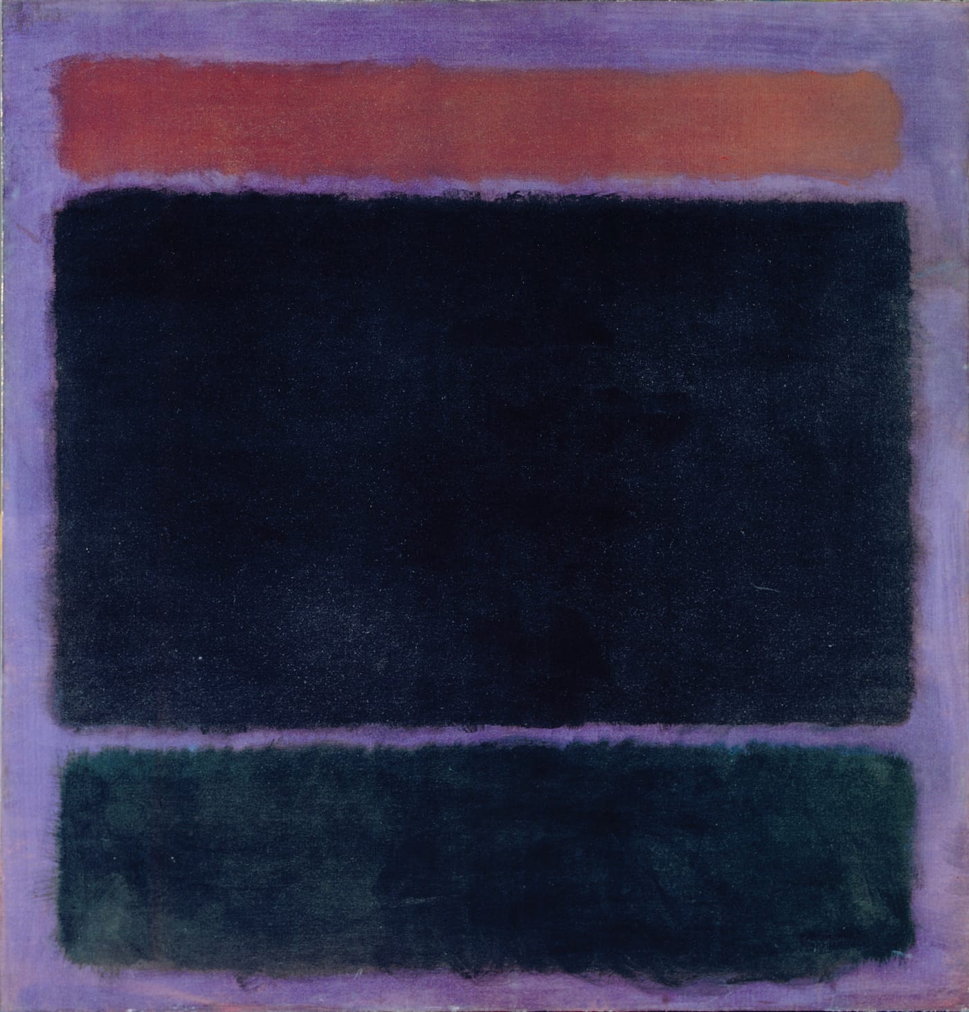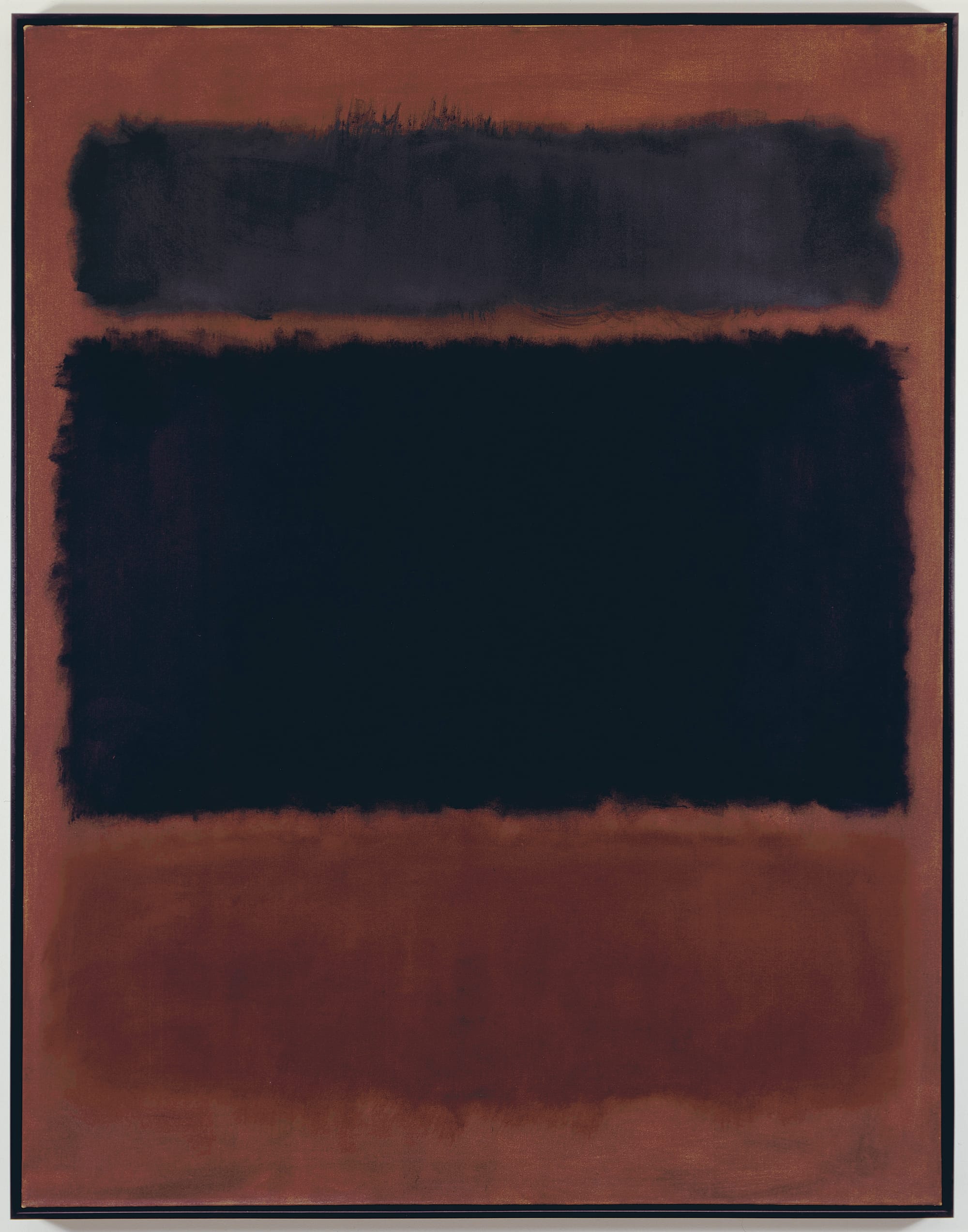 Even so, the density apparent in Rothko’s work, confusing to some viewers, may also relate to the “dialogical encounter” between the self and the other, once cited by the existential theologian Martin Buber. Here, as shown in “Untitled (Rust, Blacks on Plum)” from 1962, which confronts the viewer upon entering the exhibition, the initial opposition between the viewer and the work reveals three suspended, soft-edge, densely layered horizontal rectangles. As the color literally begins to take shape, the forms suddenly come together. To feel the manner in which color and obscurant light (within the confines of darkness) resonate in this painting would seem to require an extraordinary focus and commitment, an unheeded open-mindedness whereby some form of solitary transcendence might occur. But there is no formula by which to make an experience happen with a Rothko. Even so, one may hope that it is still within the reach of those of us conditioned by the speed (and, perhaps, the emptiness) of our constantly beckoning virtual reality.