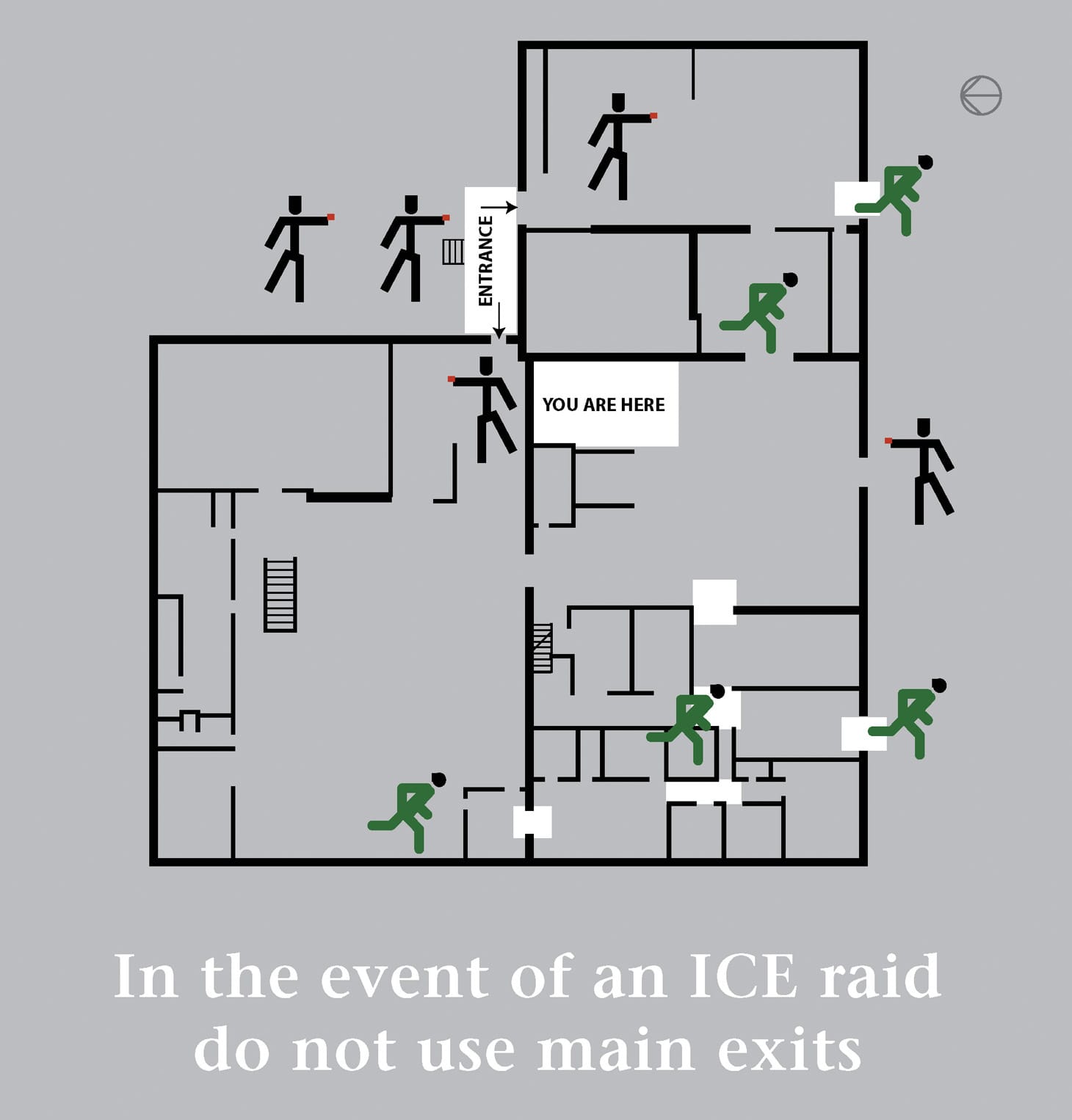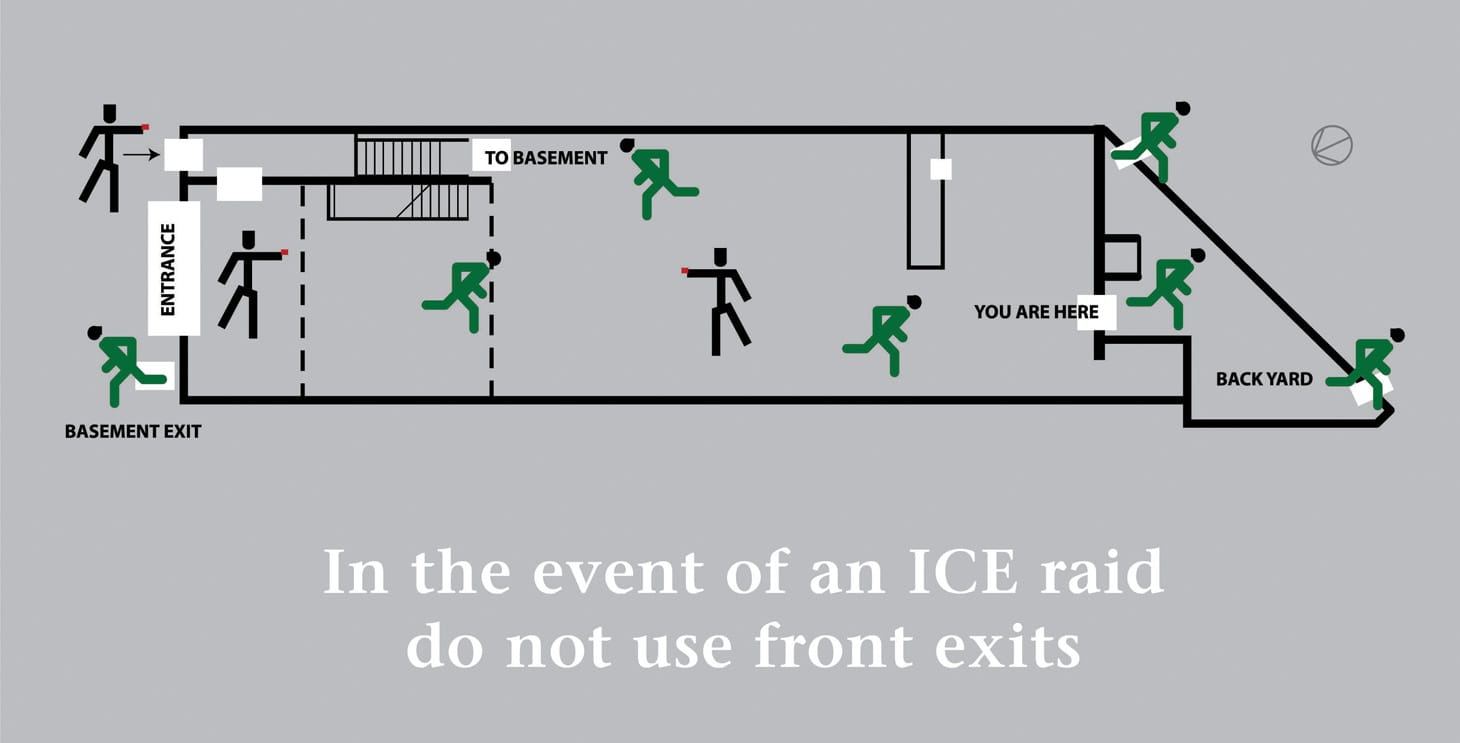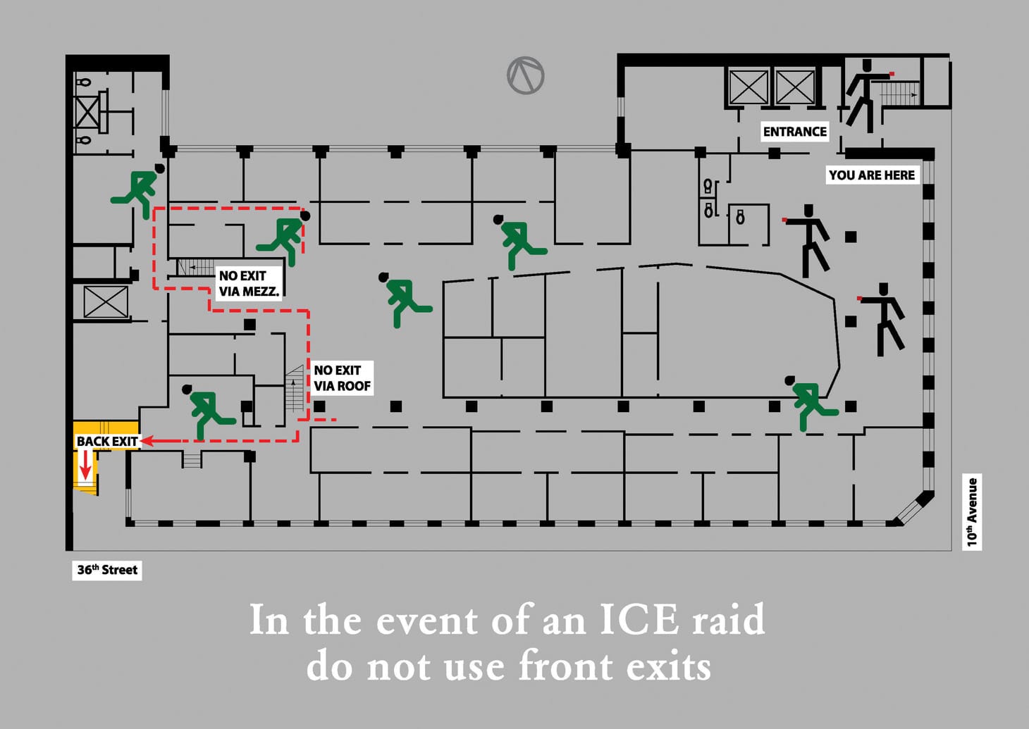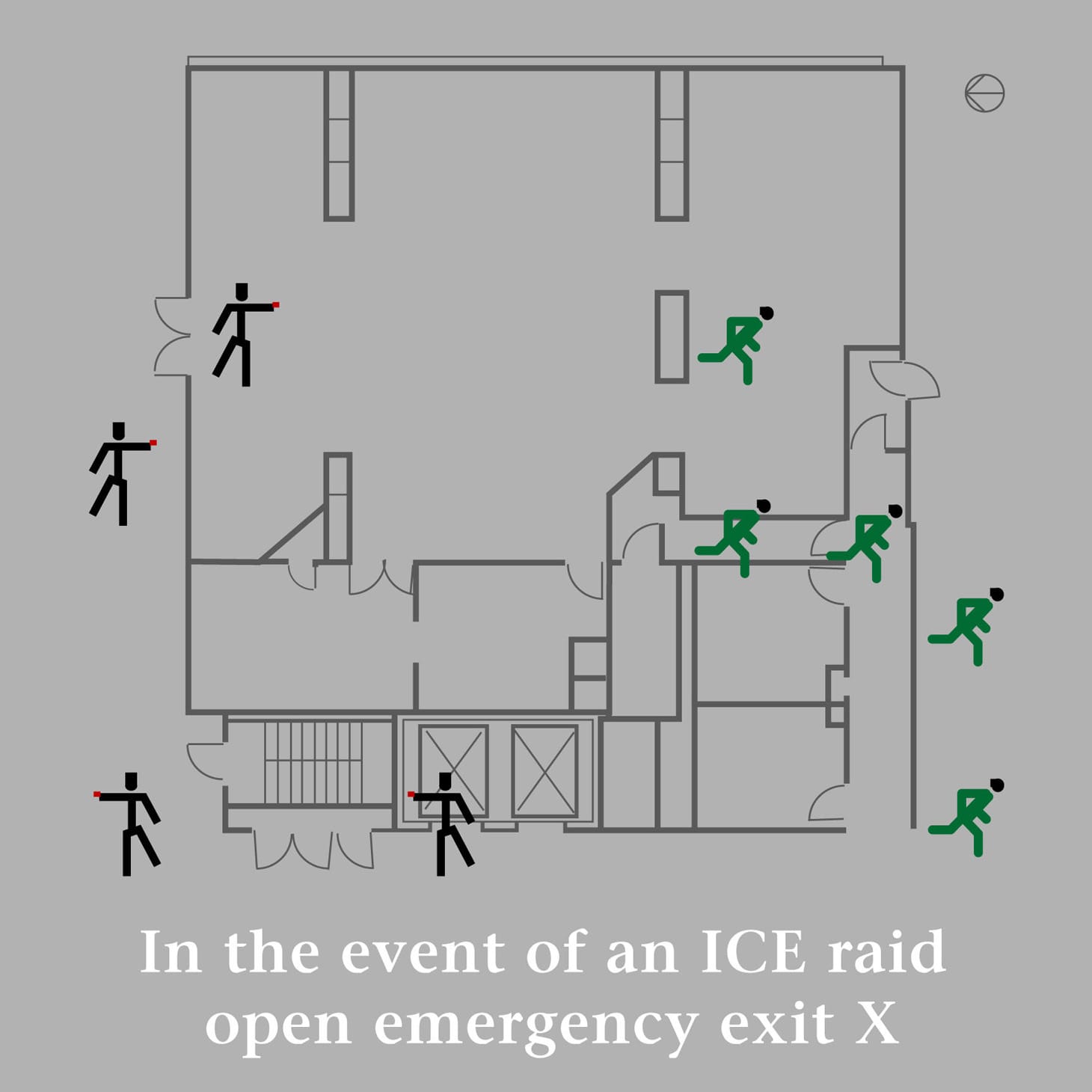 “In 2006, I was tracking the increasing workplace raids across the country, and I was in a Lower Manhattan Cultural Council residency studio in 120 Broadway, building a prototype hiding place for vulnerable immigrants disguised as part of the HVAC ducting in the raw space,” she told Hyperallergic. “I was looking at the auxiliary parts of the office building and thinking about its workforce and came up with the idea for an ICE escape sign like the building’s fire escape signs, as an art intervention that might affect the real world operation of a building.”