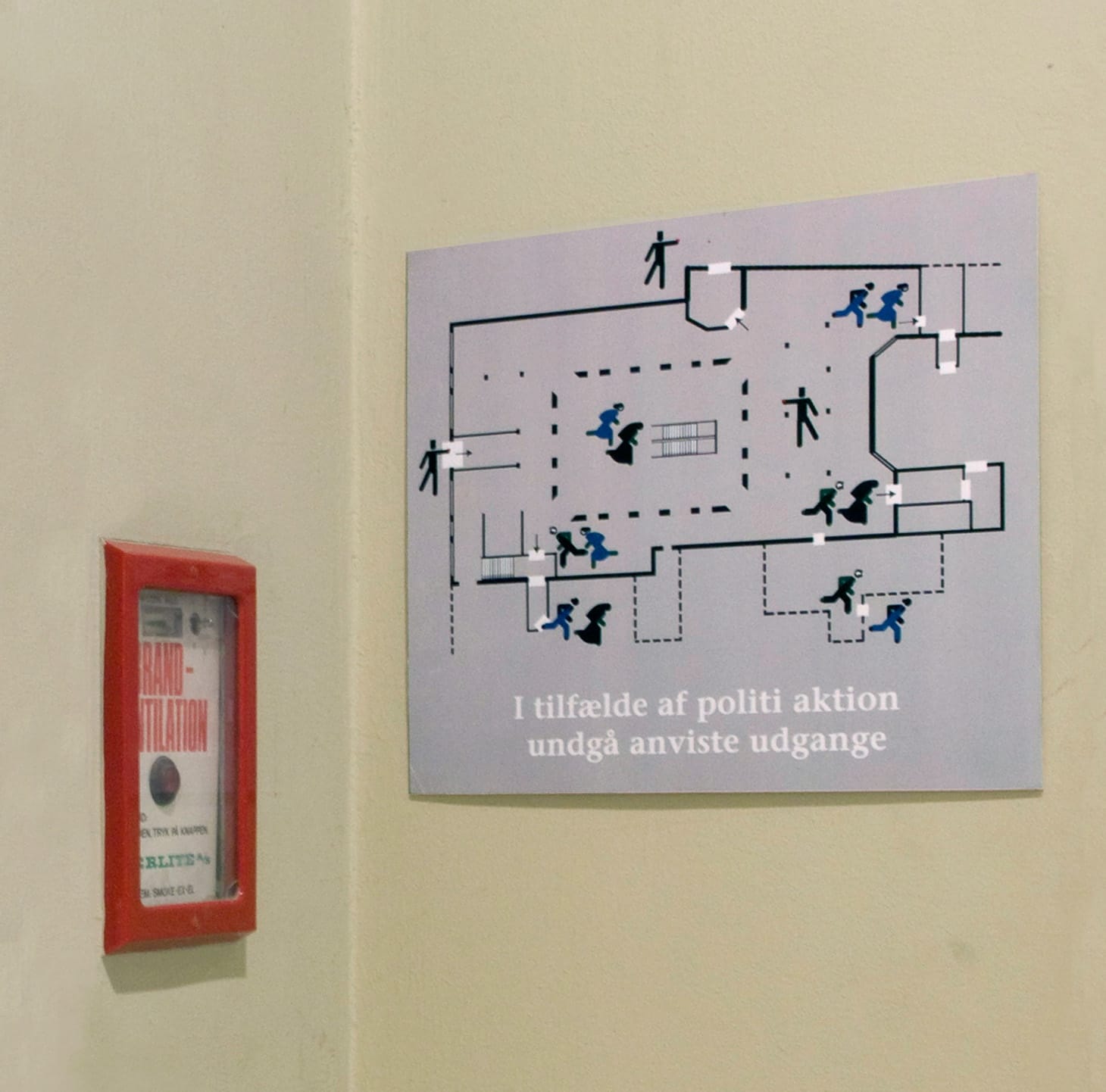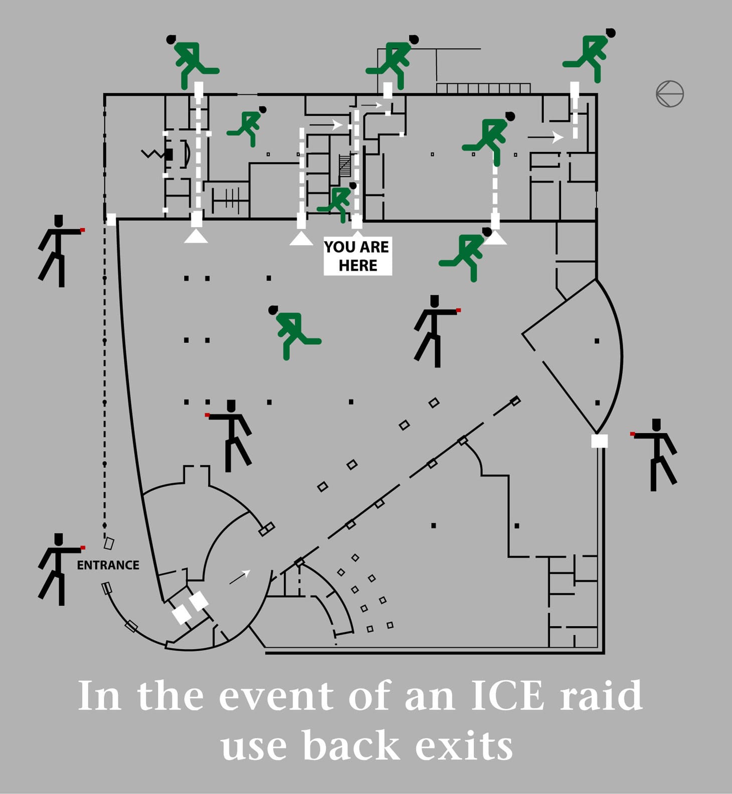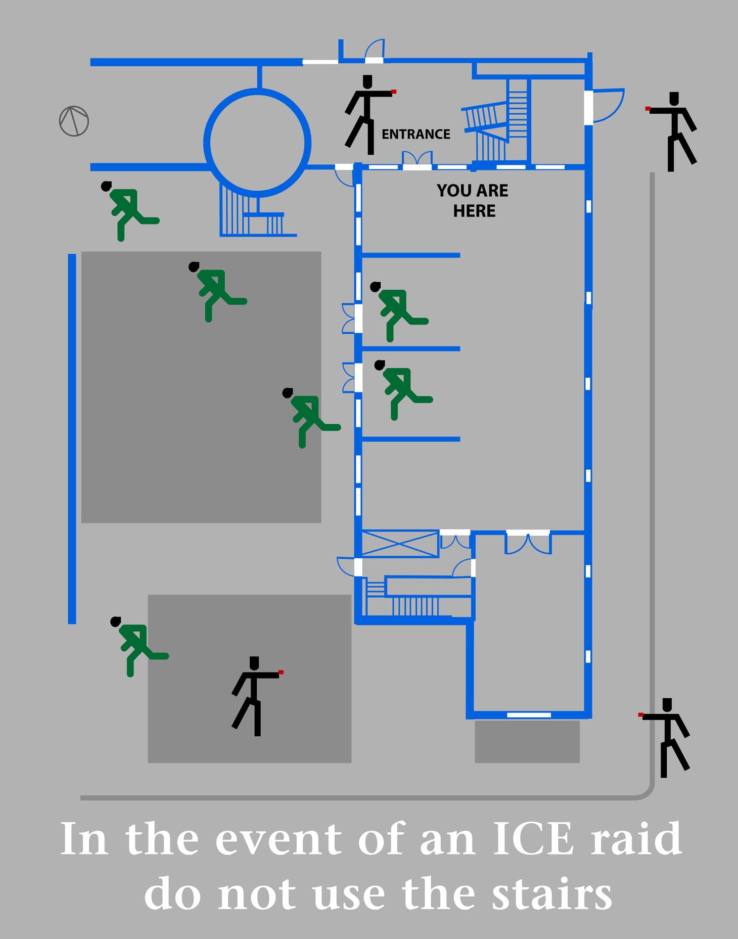 “In 2006, I was tracking the increasing workplace raids across the country, and I was in a Lower Manhattan Cultural Council residency studio in 120 Broadway, building a prototype hiding place for vulnerable immigrants disguised as part of the HVAC ducting in the raw space,” she told Hyperallergic. “I was looking at the auxiliary parts of the office building and thinking about its workforce and came up with the idea for an ICE escape sign like the building’s fire escape signs, as an art intervention that might affect the real world operation of a building.”