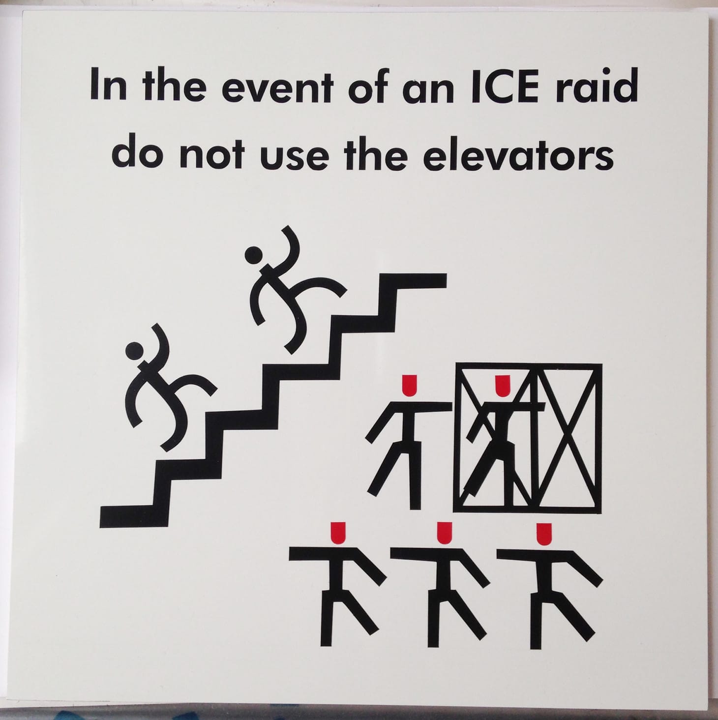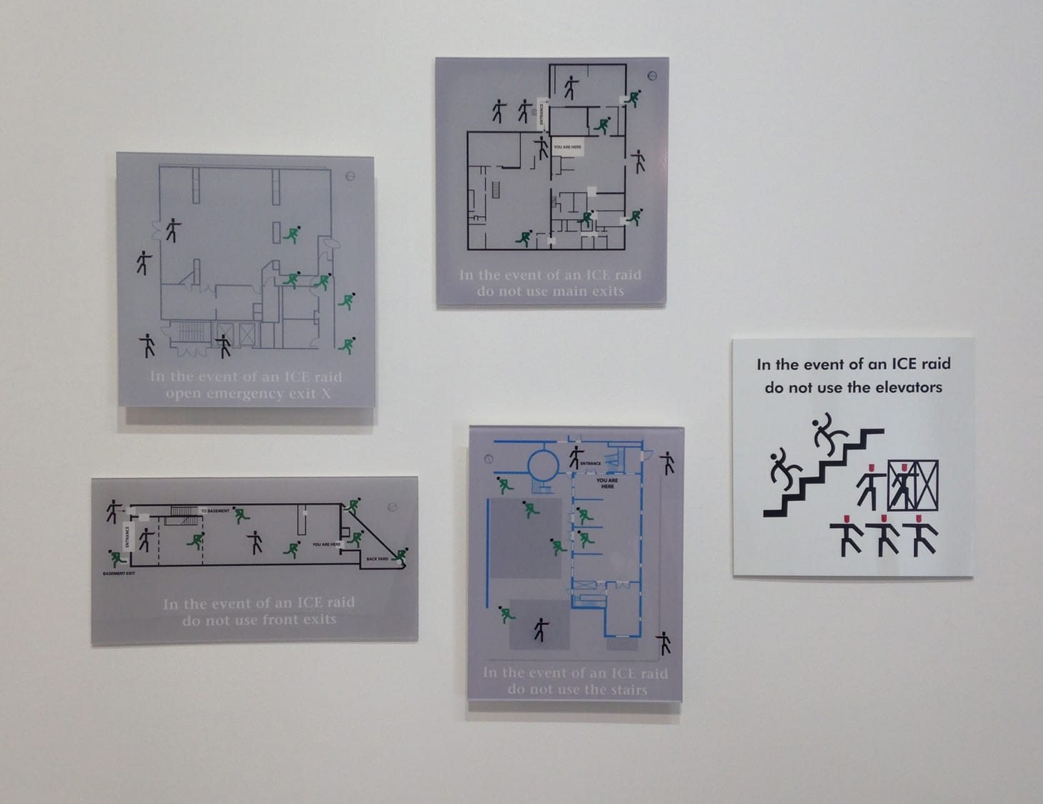 The project, she explains, seeks to infiltrate the “real spaces” of immigration politics for the non-immigrant, adding that it “is more about raising awareness in the citizen population than offering immediate use to those threatened by ICE.” The signs have a deadpan look but are intended to jolt people into a realization that these types of actions are part of daily life for the undocumented. “It is important to me to make the point that art spaces are also workplaces, and also to ask US citizens to think about breaking anti-immigrant laws,” she explained
