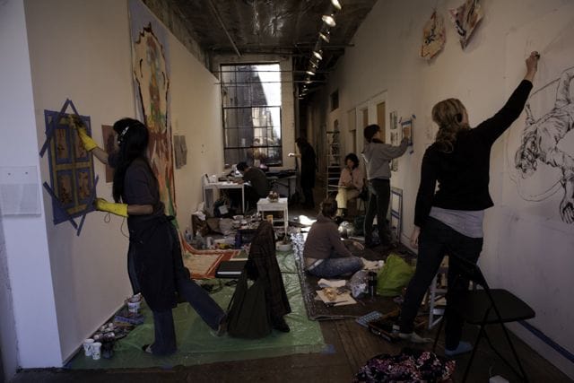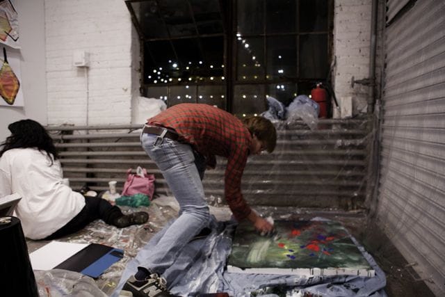 Meanwhile, artist Julie Torres was turning the second floor of Camel Art Space into a multiple-artist studio space, assigning everyone a spot according to the style of their work. Warren King expressed the need to sit by a desk when creating his subtle pencil drawings; Rebecca Litt was planning to work alternatively on the floor and on the wall throughout the night; Ken Kocses, on the other hand, received a spot at the far corner where he planned to “violently attack” several canvases.