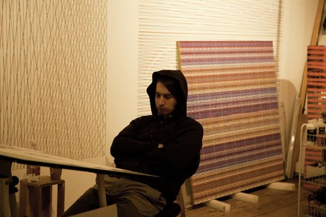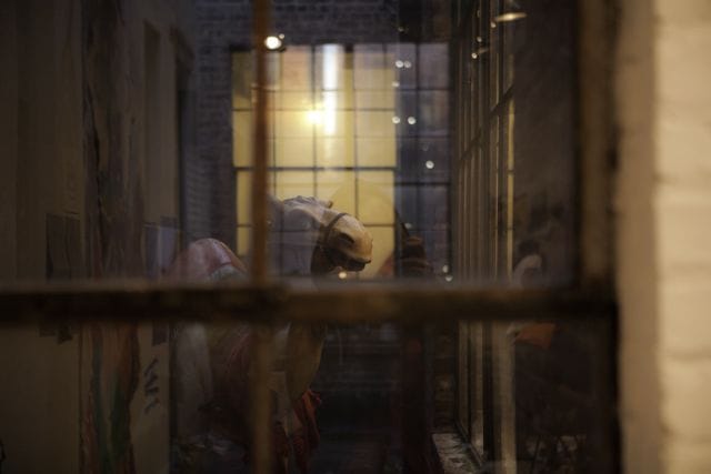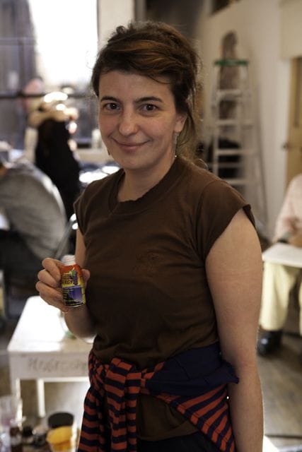 It was only a couple of minutes before midnight, when one of the last of the 13 artists arrived at Camel Art Space in East Williamsburg for the show 48 HRS. It was Rebecca Goyette, encumbered with a large bag, sewing machine and a folding table. “I can’t believe I’m doing this,” she said, laughing as the door of the black cab slammed behind her.