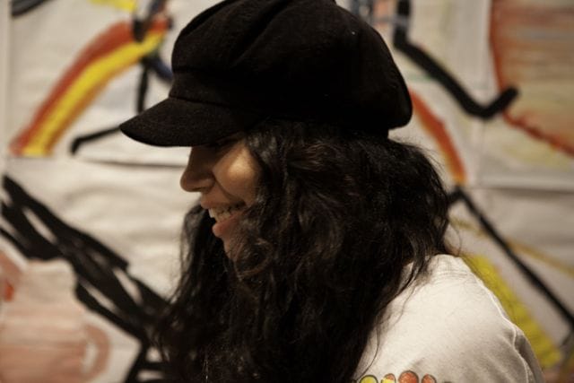 Torres has been interested in engaging the art community through durational painting for several months. In May of this year, she undertook a 24-hour long painting marathon, an event hosted by Hyperallergic at our HQ office. The second half of the marathon was public, and everyone who came was able to take one of artist’s pieces home. Another notable communal event organized by Torres was the art show So Happy Together held at Norte Maar in Bushwick. Torres gathered 45 artists for two months of collaborative drawing nights. The exhibition generated 100 drawings.