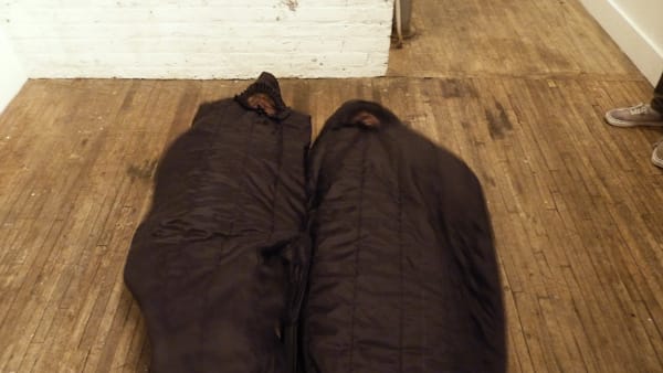 Rebecca Goyette was the only one sewing that night. She created two black “bundling bags,” with holes for faces covered with black veils. The bundling bags were connected through a tunnel for holding hands. During the opening, Goyette lay in one of the bundling bags, while another person could crawl into the other bag, hold her hand and take her on a “date.” For me, Goyette’s humorous performance became a metaphor for the entire 48 Hours event. Each of the artists took turns taking Goyette on a “date.” We cracked jokes, had fun, but the experience of being so close to her, lying in a bundle bag, felt strangely intimate.