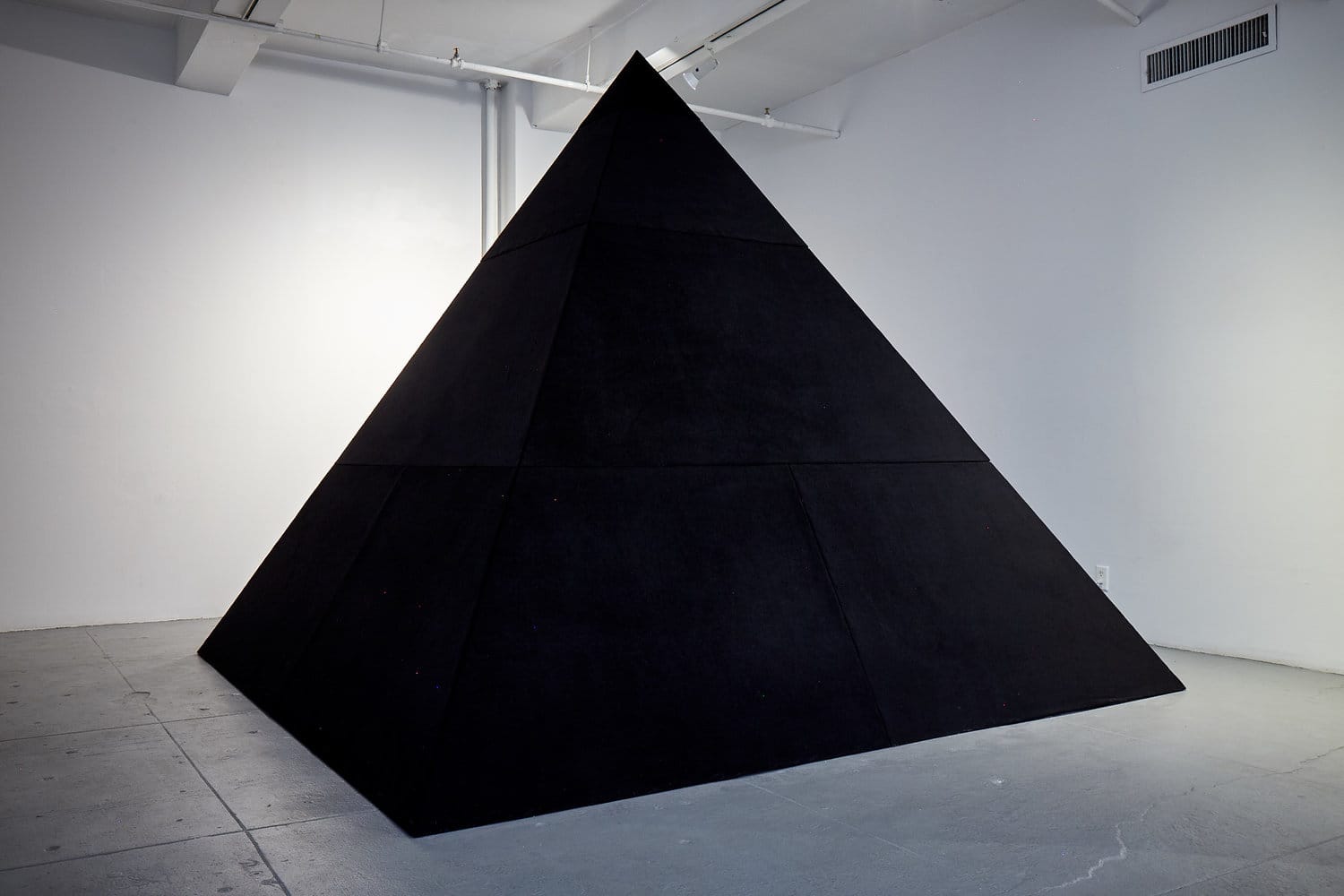 As a corrective, Leigh Davis’s pyramidal psychomanteum, Reunions (2019), tucked away in the furthest corner of the gallery, offers a secluded space for communion. The heavy, black moleskin fabric that comprises the structure’s exterior gives the work mysterious gravitas. Inside, a circular mirror has been positioned to reflect only darkness, to facilitate communication with spirits of the dead. The wall text invites visitors to enter one at a time and to bring — and leave behind — a photo or personal item to aid in contacting a deceased loved one. However, even if without such an object, sitting alone inside the dark, tent-like structure inspires an eerie calm.