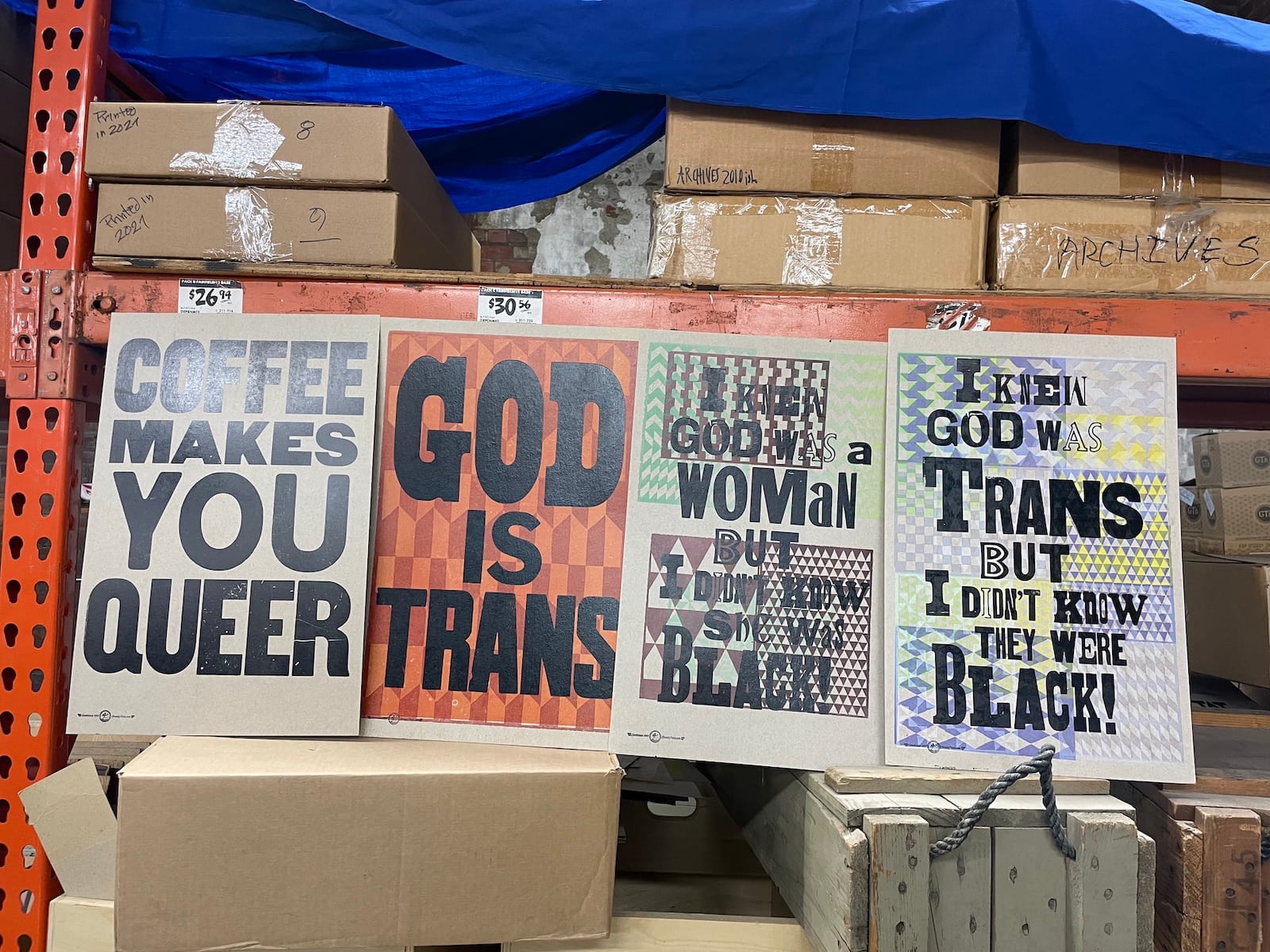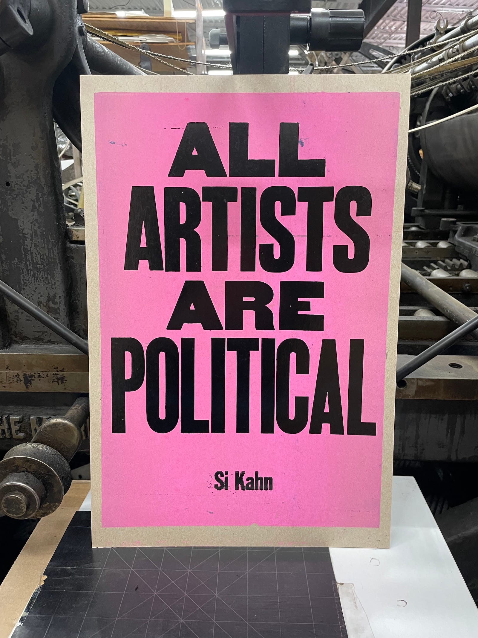 AK: Well, it is why I'm a printer, because it's about community, to bring the community together. The print shop did that traditionally. I enjoy sharing my work with my neighbors. In Detroit, I will leave posters at places I visit, especially on a regular basis. There's a bookstore called Source Bookstore where I leave posters at two or three times a year. There was a food truck that did a weekly event. A couple hundred people show up and I would take posters there, because I got rid of [the surplus], but also it helped them because people say, "Oh, I can get a poster there." And it is nice to have something where people say, that's handmade, that's not off the computer. Nobody can buy them [directly] from me.
