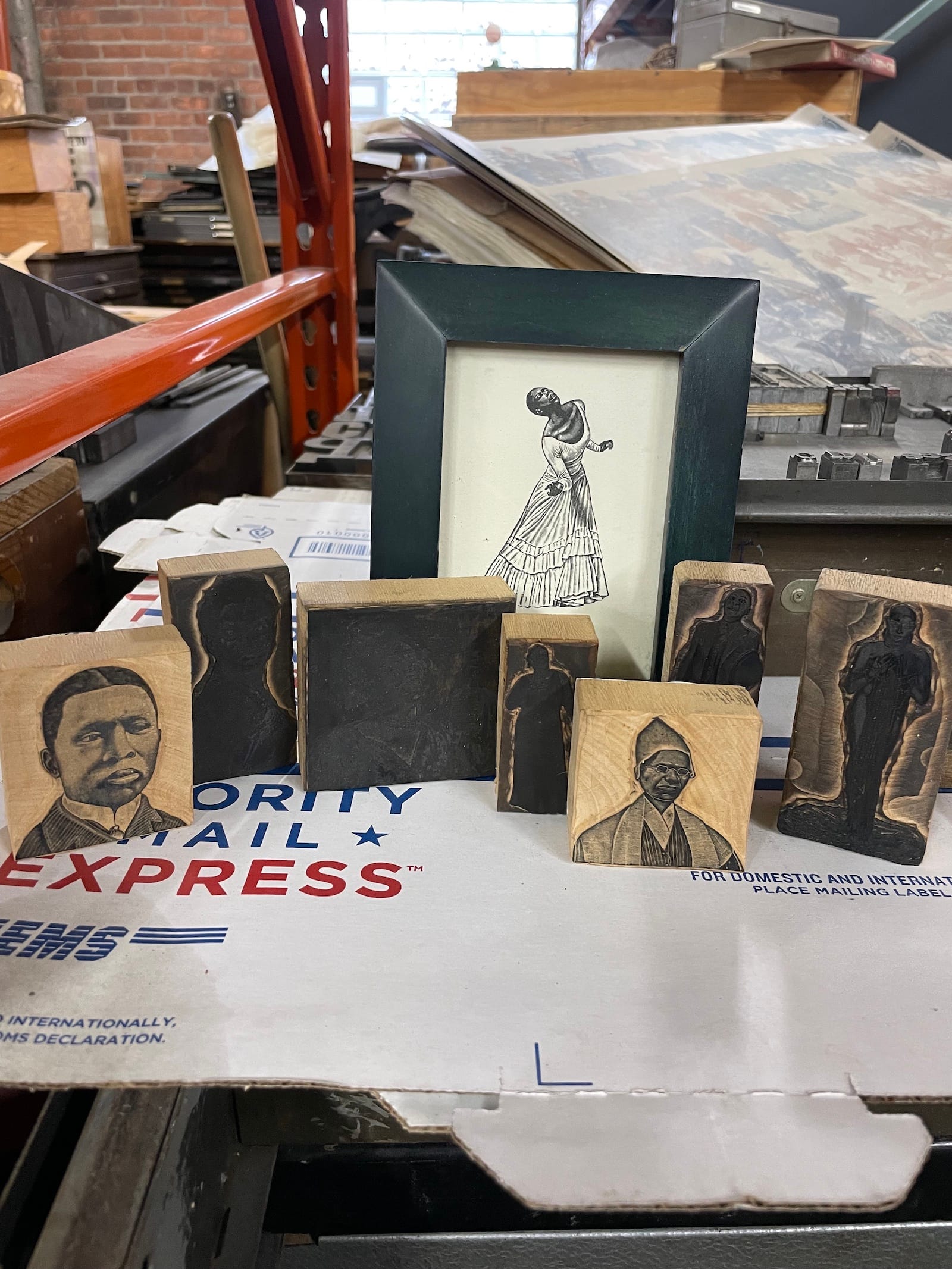AL: Earlier you showed me the printing blocks that you had made portraying Black figures like Bojangles, Katherine Dunn, Judith Jameson, and Josephine Baker. How did those figure into your work and what made you want to make them?