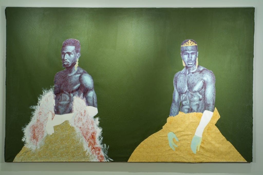 Yet another source of tension are the shades Armstrong utilizes; moving from the show’s entrance, viewers will notice that the use of brown — the hue we might expect to figure most prominently into an exhibition of Black portraits — is withheld in all but three of the images (strategically placed toward the end of the show). Rather, with new eyes...is largely composed of pastel portraits — provoking us to consider all that Blackness is when our understanding of race is not tethered to skin shades. This feeling of tension is sustained throughout the exhibition: the works are complex but feel unfinished; masculine subjects don ball gowns, tiaras and floral prints.