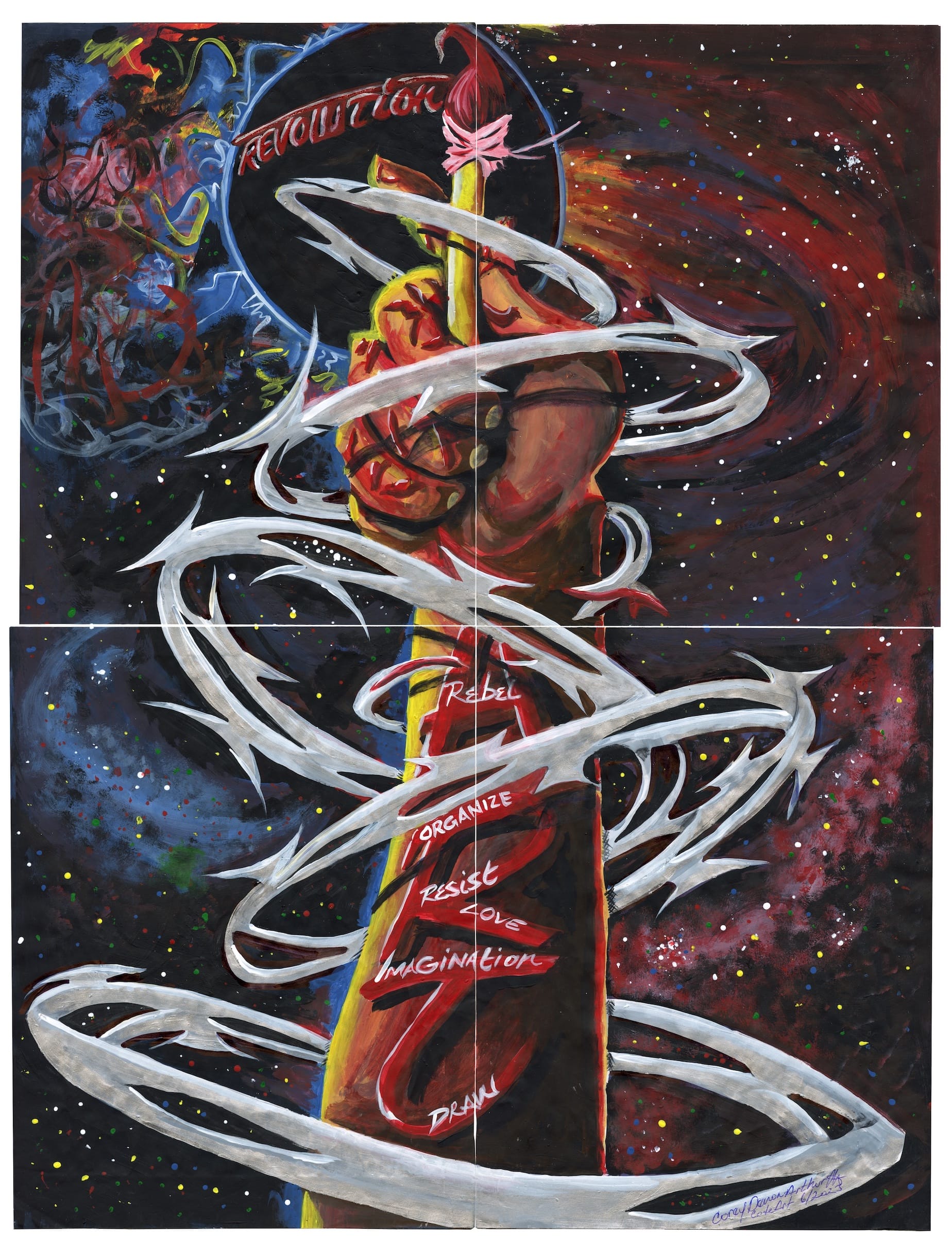 A display of stitched-together artworks by author and artist Corey Devon Arthur, who has been incarcerated since he was 19 years old, provides visual evidence of how artists in prison also struggle under strict mail censorship policies. Separated into equal-sized quadrants, Arthur’s mixed-media works were mailed to the exhibition organizers in four separate envelopes that were later pieced together for display. But while Arthur’s art made it out of Otisville Correctional Facility, where he is currently being held, other pieces commissioned for the show remain missing, like those of incarcerated artists Lamavis Comundoiwilla and Elizabeth Lozano, who mailed out their portraits of imprisoned writers Zhi Kai and Kwaneta Harris over a month before the show’s opening. In the portraits’ absence, the exhibition organizers displayed photographs of Kai and Harris in their place.