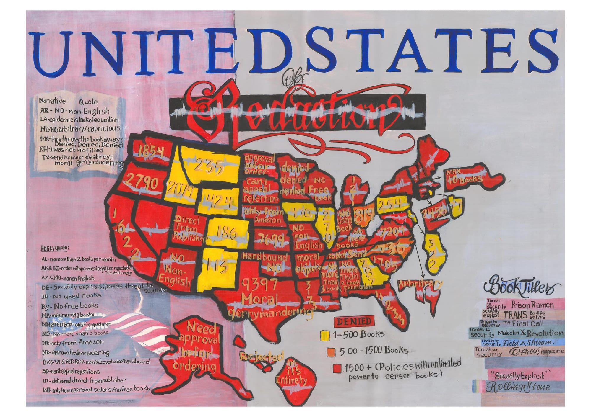 Moira Marquis, a project manager for PEN America’s Freewrite Project in the nonprofit’s Prison and Justice Writing program, explained that incarcerated people struggle to outsource reading material. This is illustrated across the three artworks by Pablo Mendoza, Danbee Kim, and Kruttika Susarla that reinterpret Faith Ringgold's offset lithograph “United States of Attica” (1972) mapping carceral censorship across the country. These restrictions on literature are further explored on another wall that displays four collages by Marquis and Araya Ratanaphruks incorporating printed prison narratives and archived returned mail from PEN America’s prison writing program with gold leaf detailing. The barriers imposed on reading material also impacts writers in prison, as drafting any sort of publication is often “time consuming and cumbersome” due to policies that require physical mail to be scanned and digitized.