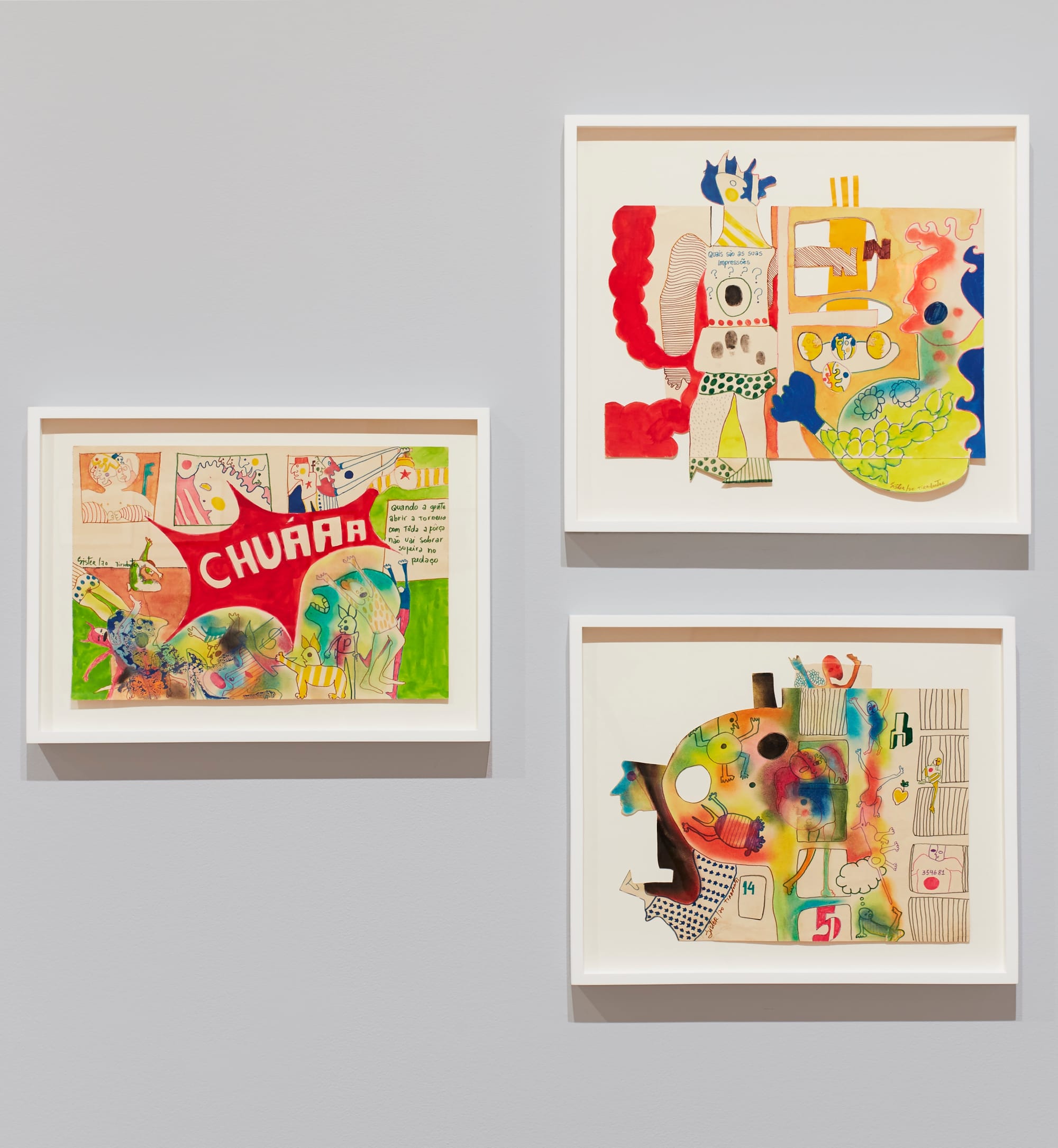 Many pieces move beyond the documentary, utilizing a more emotional, expressionist language to capture the singular experience of incarceration. The most stirring works here are Halina Olomucki’s, created during her time in the Warsaw Ghetto and, later, the Majdanek extermination camp. “The Woman and the Agony” and “The Prayer” (both c. 1939-42), with their stooped, curled, and crawling figures, punch you in the gut, their slight forms ripple, flowing from the wave of horrors revealed to the world upon Allied liberation. Sérgio Sister’s “How about running away from jail” (1970), on the other hand, is a vibrant, Pop-inflected call of protest, created while he was detained and tortured by the forces of the Brazilian military dictatorship.