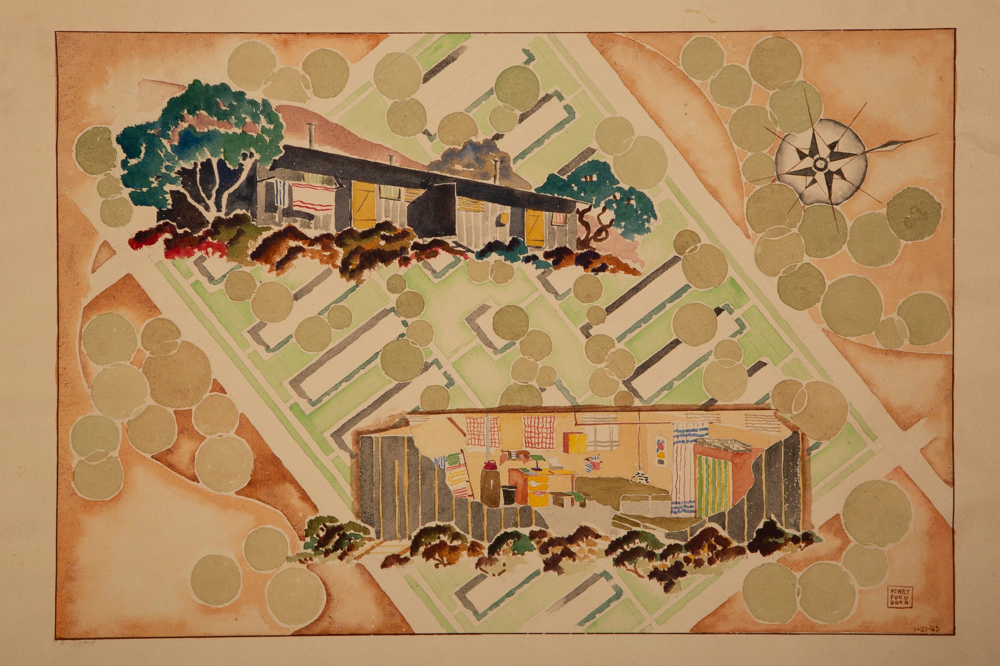 Political imprisonment is no stranger to American soil, and a collection of works from the World War II-era internment of Japanese -Americans also reveals expressions of hope. Witness Henry Fukuhara’s detailed watercolor-and-graphite architectural sketch of a dam from 1942. The native Californian sketched scenes from life in the Manzanar concentration camp and created plans for buildings and infrastructure to better life there. Even when treated as an enemy by his own country, Fukuhara strove to improve the lot of those around him.