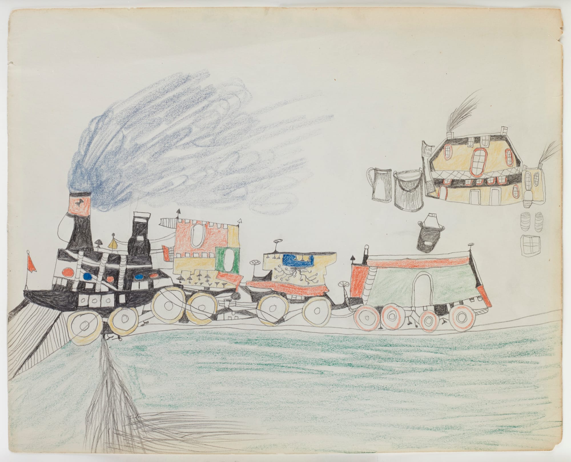 This direct observation of life inside — a documentary expression of lived experience, common throughout art history but here suffocated by the walls of imprisonment — is a constant trope in the show. Bear’s Heart (Nokkoist) was a Southern Cheyenne artist captured by the U.S. Army and taken to Fort Marion in St. Augustine, Florida, following the Red River War. His work often recorded the forced journey and a ledger drawing attributed to him depicts the train used to transport him and other captives, a conflicted, colorful construction that is part whimsical and part ominous.