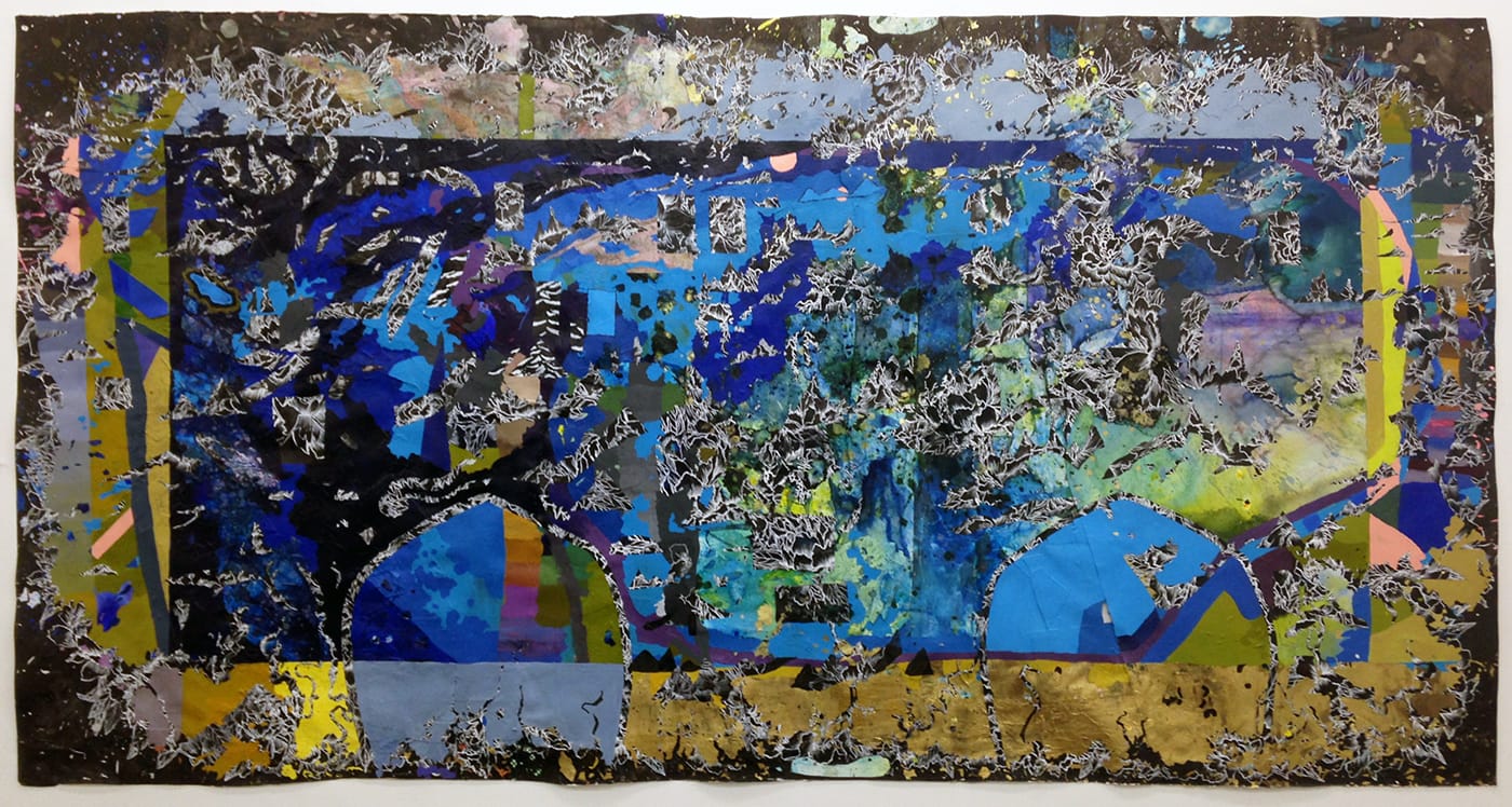 Perhaps that’s the source of the tension in these works: diverse materials and techniques are forced together within the confines of the paper support, but they refuse to assimilate, retaining their individual identities as metallic sheen, multicolored tissue, floral print, acrylic paint, Sumi ink. Mann, who won a Fulbright to Taiwan and learned paper-making in India, guides these elements through accident and design into a precarious balance of harmony and clangor, an empire of the senses (to repurpose the title of Nagisa Ōshima’s transgressive ‘70s exercise in erotic cinema) where seduction vies with firepower as the weapon of choice.