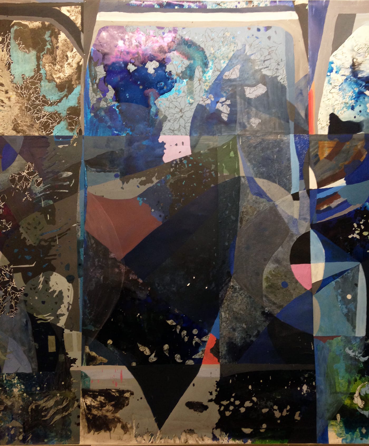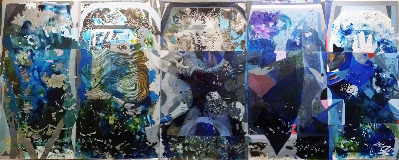 Each of the five sections represents a tour de force of painting technique, as shards of patterned shapes float across washes and spills in contrasting shades of blue, and white-on-black, finger-like obtrusions simultaneously reach up toward the arch and splinter like cracked crystal. The lower portions of the three rightmost sheets are sectioned off into horizontal bands that could indicate a floor or a flood, while the upper areas are rippled by multiple explosions of line and color: sky blue; dirt brown; sea green; rose pink.