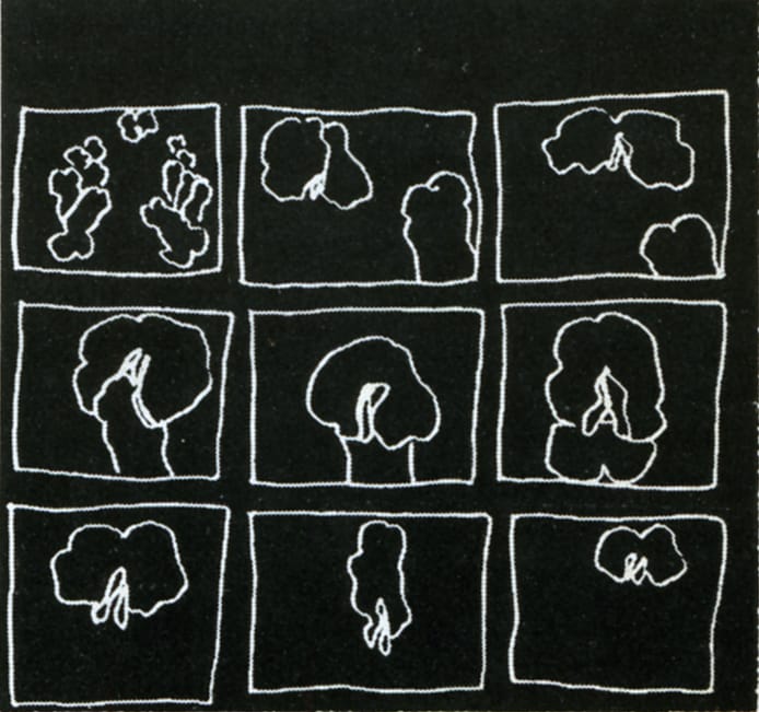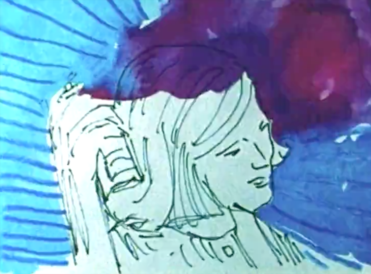 Famous for commissioned murals that decorate Boston’s MBTA Green Line, artist Mary Beams gets a kind of miniature retrospective within Shellenberger’s program: her hand-drawn squiggle line animations are triumphs of simplicity, protoplasms that can be withholding and mysterious (Whale Noises more than delivers on its premise), but never less than human. A trio of short works between 1975 and 1980 animates footage that appears to be taken from the artist’s own life; she seamlessly moves from “camera angles” (such as when she looks down a pair of legs in the bathtub in Tub Film, or makes silhouettes of passengers on a bus in Going Home Sketchbook) to a simple line on a page. Like the best animation it doesn’t just please the eye, but also inspires: Beams points to a febrile world of experience that can’t be reduced to a mere sequence of moving pictures, but gives it her best shot anyway.