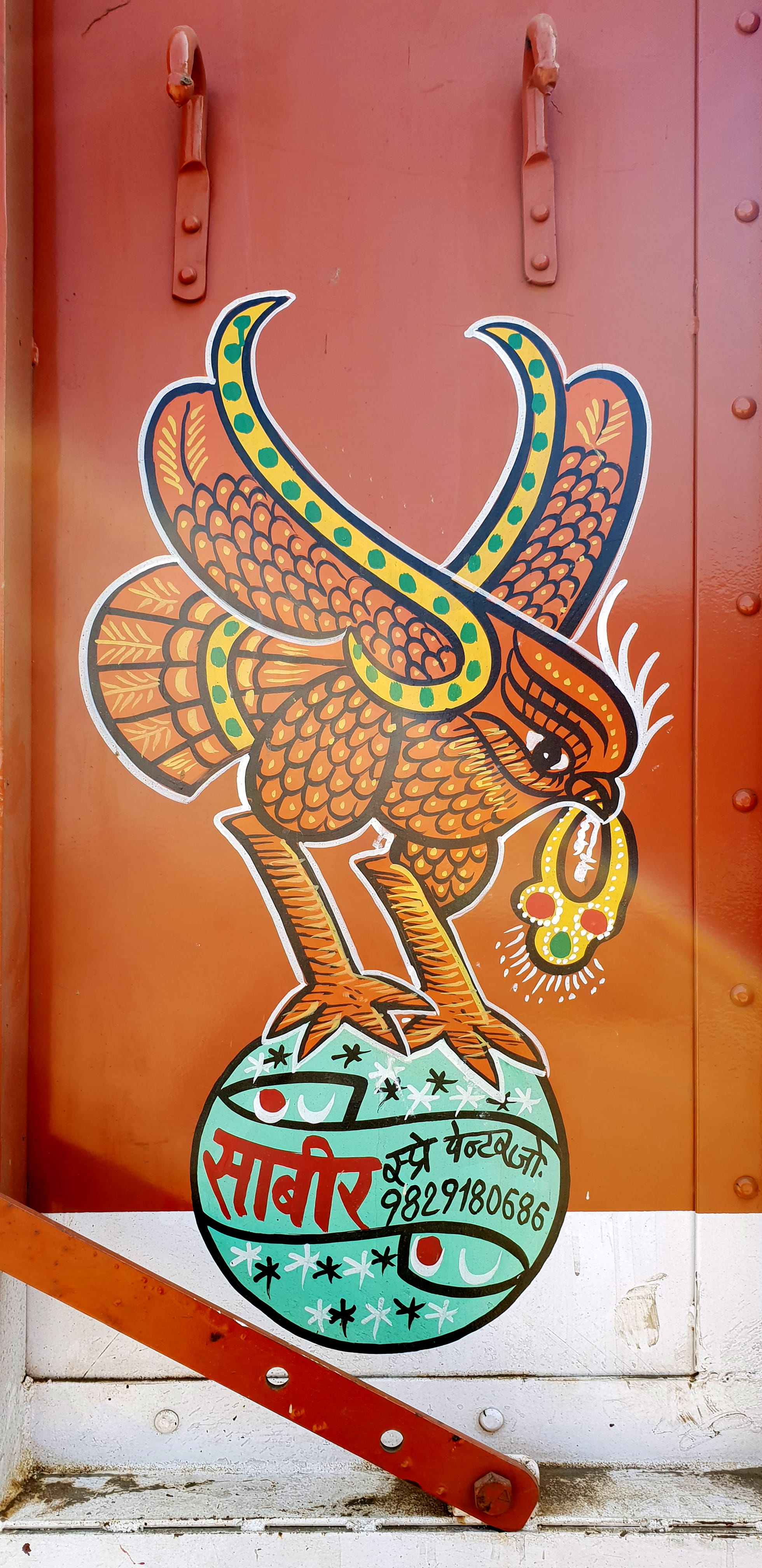 From golden-crested eagles to ruby-lipped roses, he has drawn them all. The handiwork on the truck — from the crown to the number-plate — is a patchwork of the truckers’ emotions, aspirations, faiths, and cultural roots. “One of the common motifs painted on trucks is a white cow nuzzling its calf,” explained Dongre. “It reflects the driver’s yearning for his mother while he is on the road, or the understanding that he will always be protected by her. The eagle represents speed, but also the feeling that no matter how far it flies, its eye will always be towards its home.”