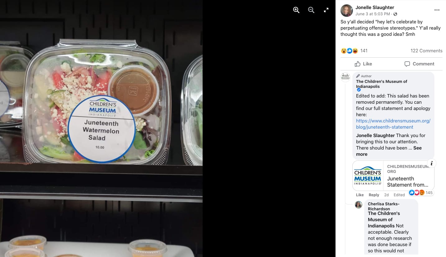 In the comments section of the museum's June 3 Facebook post about the event, one user shared a picture of a “Juneteenth Watermelon Salad” for sale in the museum’s food court.