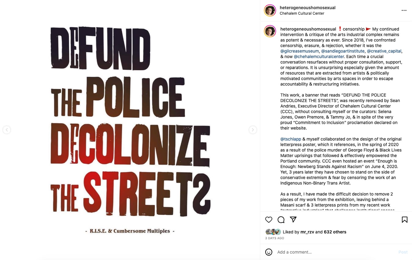 "I pulled my work immediately in a gesture of refusal as both an artist who was born and raised in Oregon, and a Matriarch who is connected to our tribal territory in Oregon since the beginning of time," Ball said. "We're well aware of the continued settler violences here, and the CCC’s actions are perfectly in line with the historical and continued settler violences." The artist has also requested that her gallery statement in place of her work to be replaced with a simple "booooooo."