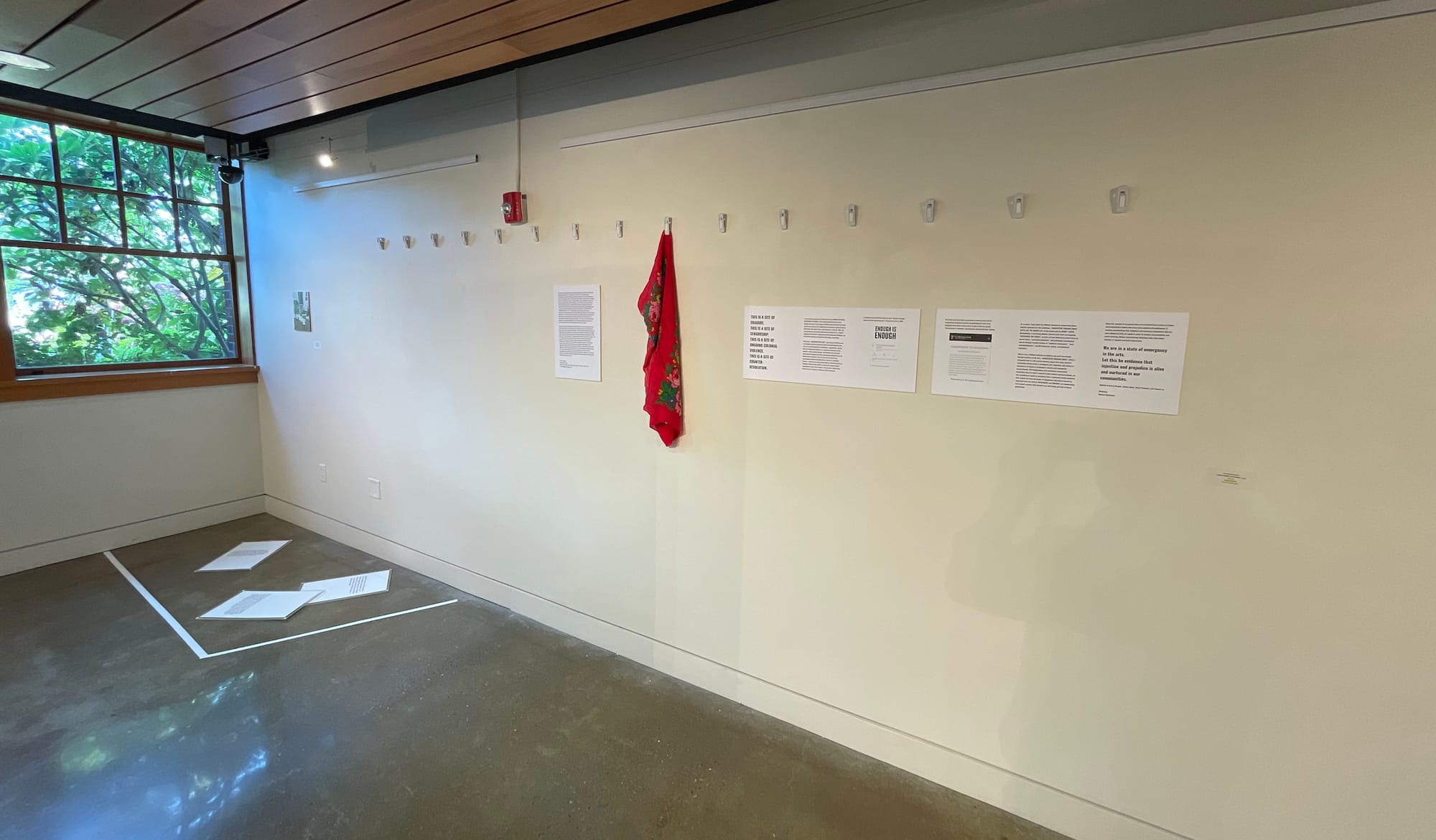 “This mostly empty gallery wall space serves as a collective expression of our dwindling freedoms and quickness to violence, with the Mansani scarf offering a direct but gentle reminder of our complicated American story,” the curatorial team’s statement reads. Artist Natalie Ball confirmed with Hyperallergic that she withdrew her work from the show entirely when she learned of what happened to DinéYazhi'.
