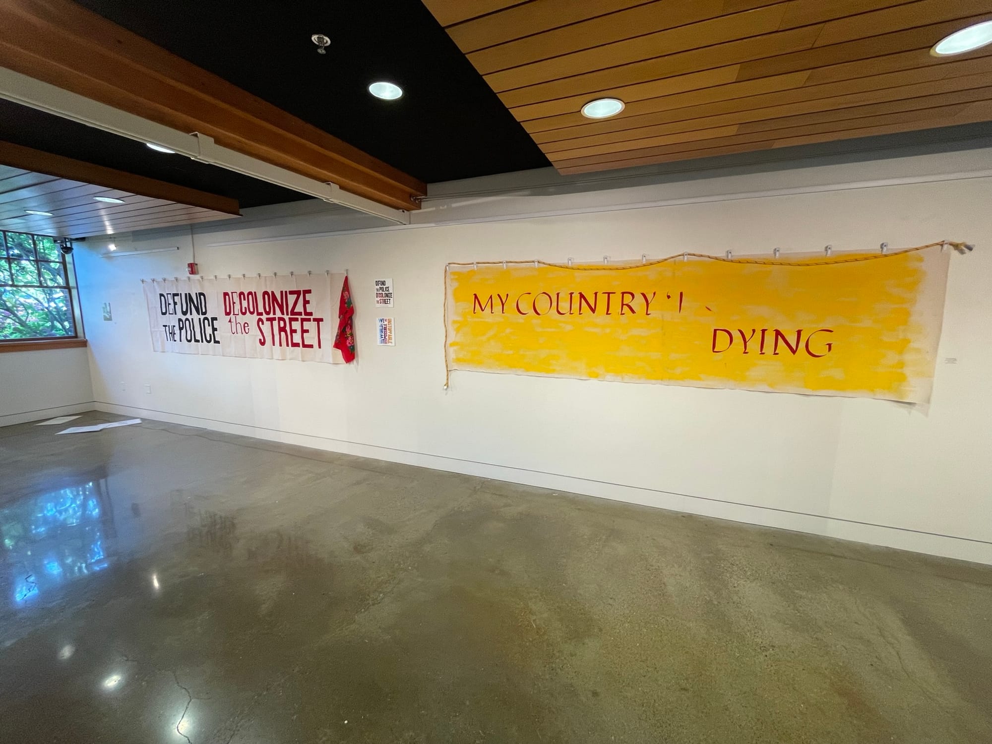 Since the banner removal, DinéYazhi' has opted to withdraw their lithograph print and the yellow-painted banner from their section of the exhibition, leaving behind the Diné Masani scarf and the three extractive industries prints that directly critique institutional statements of solidarity, land acknowledgment, and diversity commitments. DinéYazhi''s statement now occupies the former banner space, calling it a "site of erasure, censorship, and colonial violence."