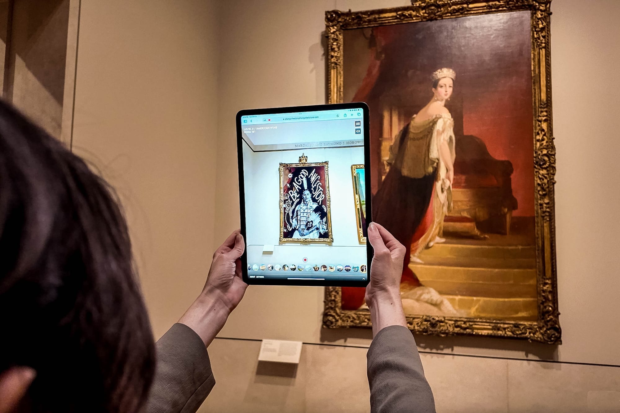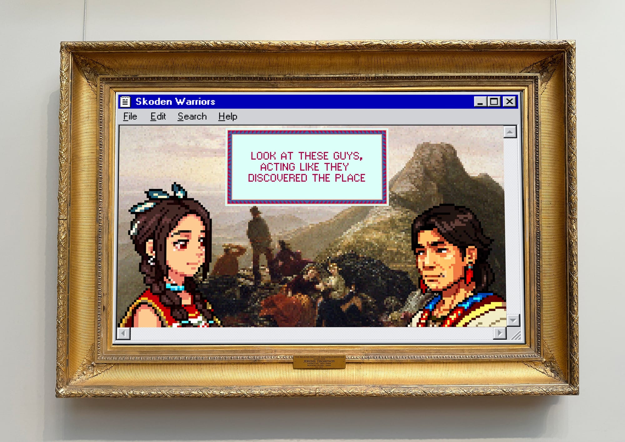 The project begins at the museum’s exterior, continuing through the American Wing’s atrium and its second-floor galleries. Using your phone’s camera, you might watch how photographer Josué Rivas transforms Thomas Sully’s “Queen Victoria” (1838) into Acosia Red Elk, an Umatilla jingle dress dancer who implores you to “be a good ancestor (“Standing Strong featuring Acosia Red Elk,” 2021). Jerome B. Thompson’s 1858 canvas “The Belated Party on Mansfield Mountain” is interrupted by two 8-bit Skoden warriors, a comic-book caption above them reading: “Look at these guys, acting like they discovered the place” (Cass Gardiner with BirdxBird, “Skoden Warriors,” 2025). Visiting the project’s website while at The Met will unlock these interventions, some of them newly commissioned and others created specifically for the experience.