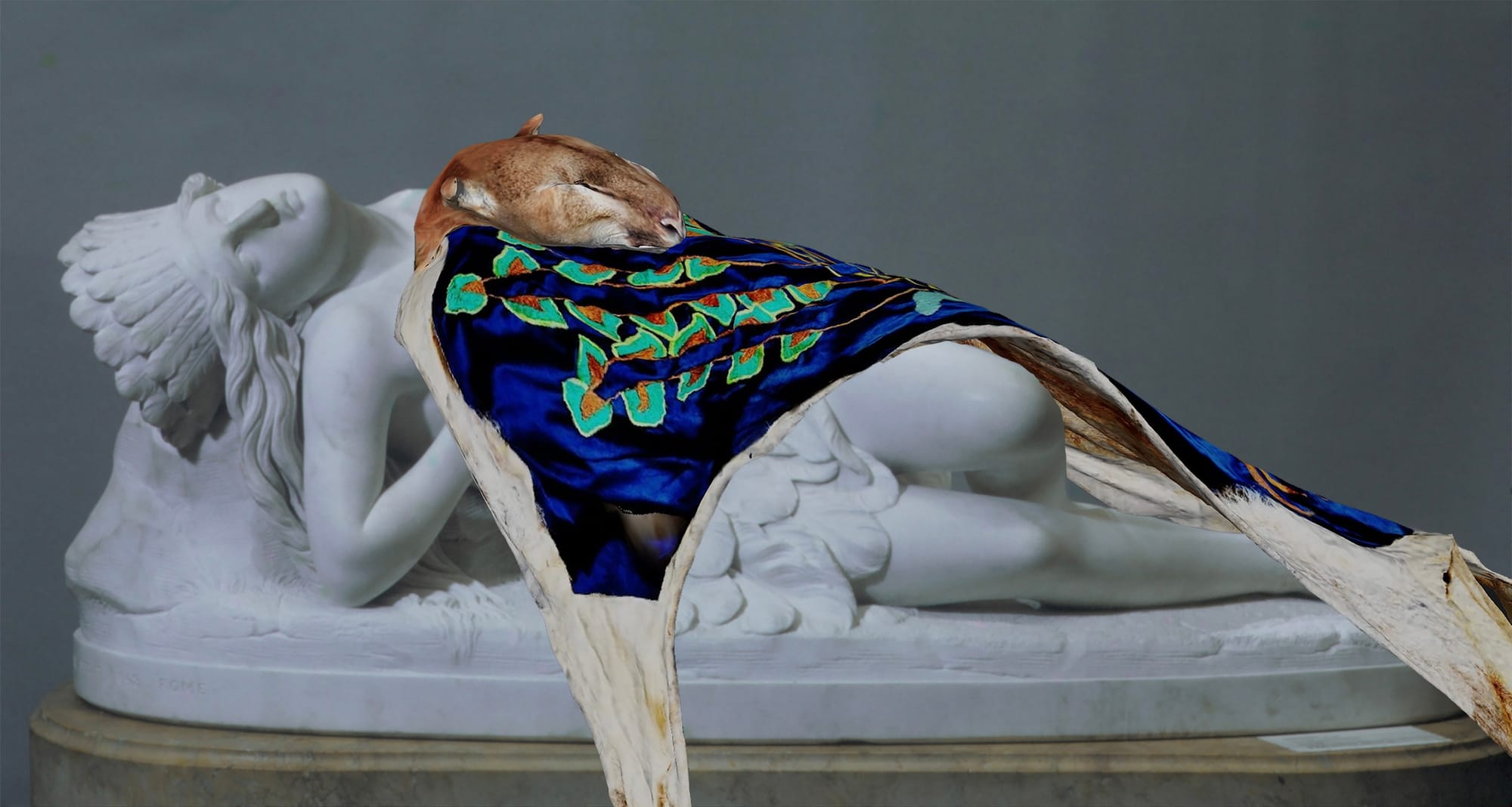 Luger’s work, “Midéegaadi: Fire” (2021–ongoing) superimposes a buffalo dancer onto Thomas Cole’s “View on the Catskills – Early Autumn” (1836–37), in the form of a graceful giant. In another piece, the dancer appears to walk above the museum’s Fifth Avenue entrance. He’s calling back, he said, “the original inhabitants — the buffalo and their human relatives,” insisting “that our relationship to this land never disappeared.” This is key, said Rector, “at a time when so many narratives are being actively erased.”