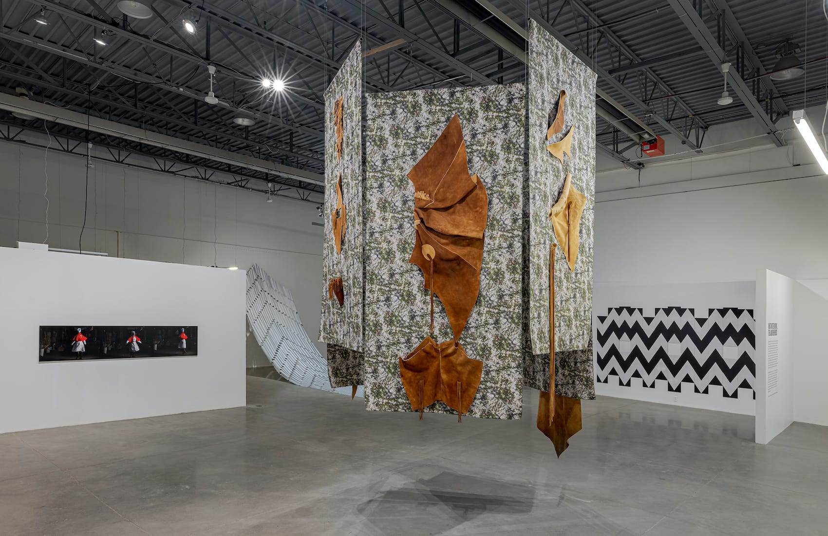 One thread running through the Biennial is how contemporary Indigenous artists refashion traditional craft. The Rich Lake, Alberta-born artist frequently incorporates labor-intensive crafts like caribou hair tufting and beadwork into wearable art, exploring her Métis identity. The process of hide tanning forms the basis of Malbeuf's "Kahikiyaw kikway (All of Everything),” on view at Arsenal. "Kahikiyaw" shifts away from embellishment to revel in the unadorned process of creating the home-tanned hides. Malbeuf will show the wearable works at the upcoming Indigenous Fashion Week, and the artist will eventually gift each garment during the exhibition's run.