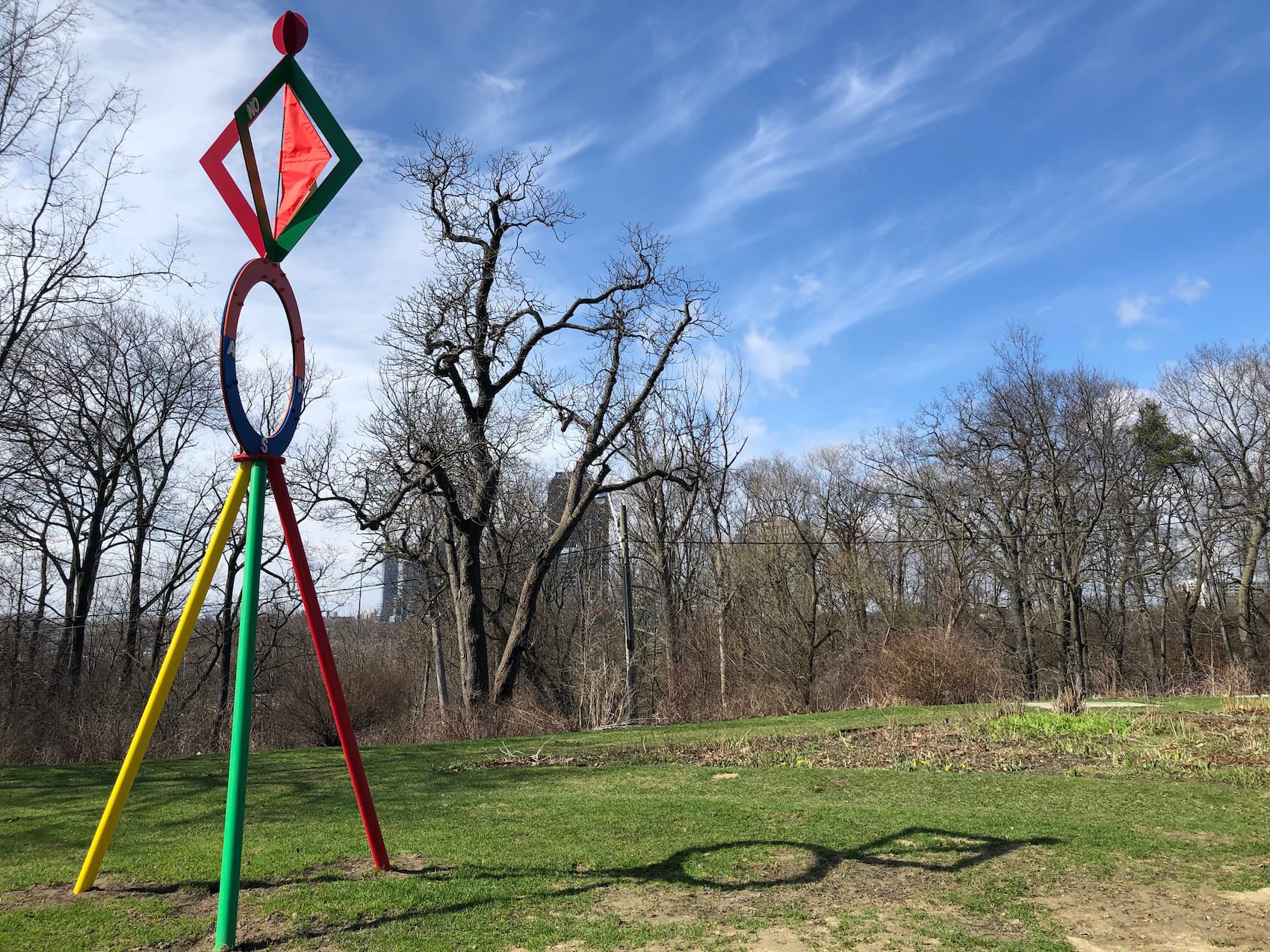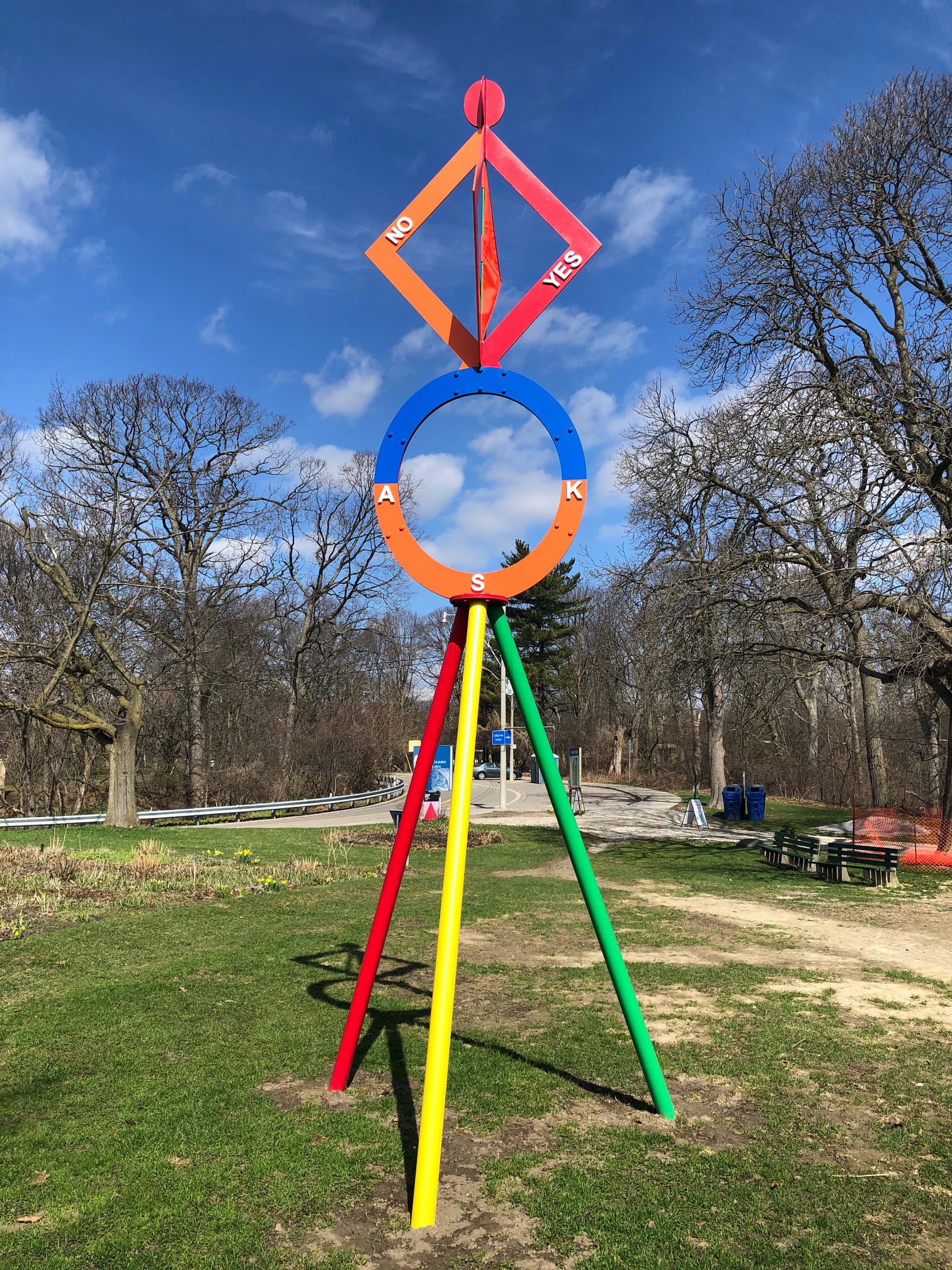 The Argentinian artist's brightly colored steel sculpture stands on a grassy knoll near a pollinator garden. Its form evokes the old windmills that dot Argentina's pastures and perhaps even the geometric surrealism of Argentinian artist and writer Xul Solar. Depending on the direction of the wind, a red triangular flag flits between "NO" and "YES," allowing viewers to leave their decision making to the air currents. The site-specific work, part of a wider outdoor commissioning series in response to COVID-19 restrictions, brings pseudo-compass-like navigation to the city's largest public park.