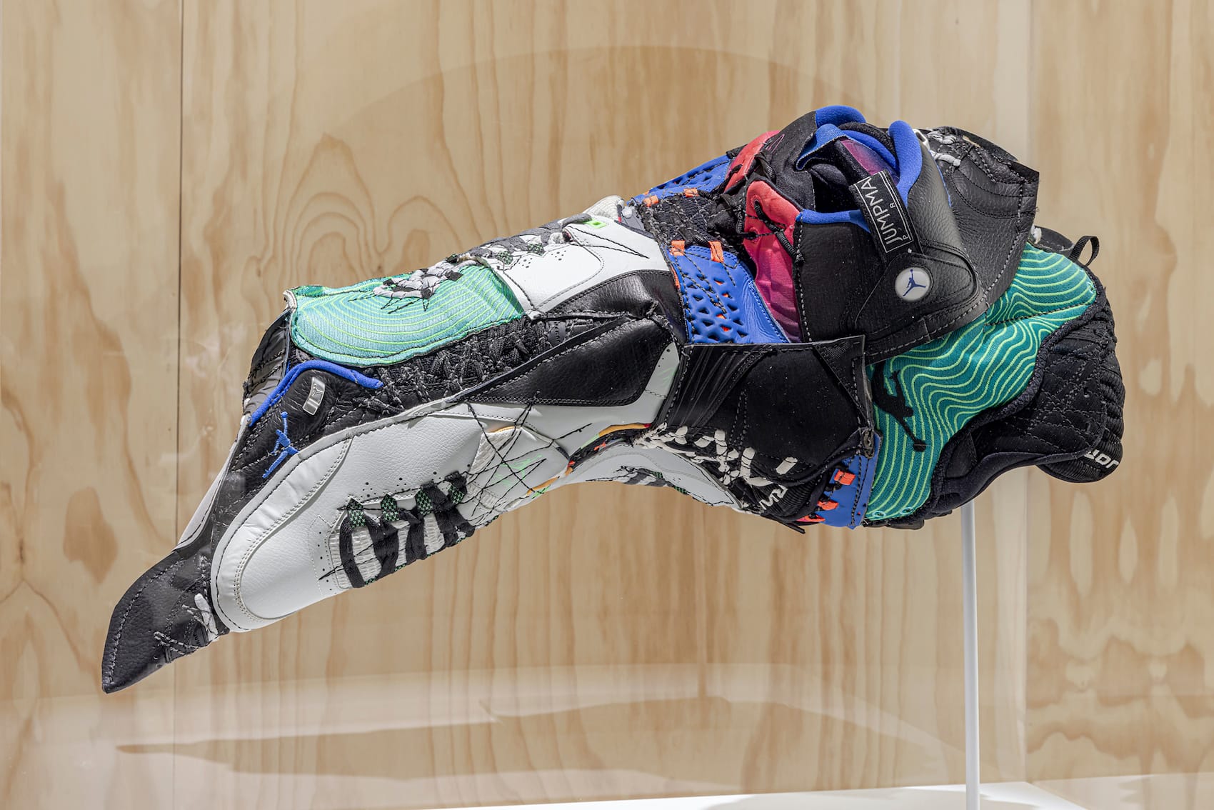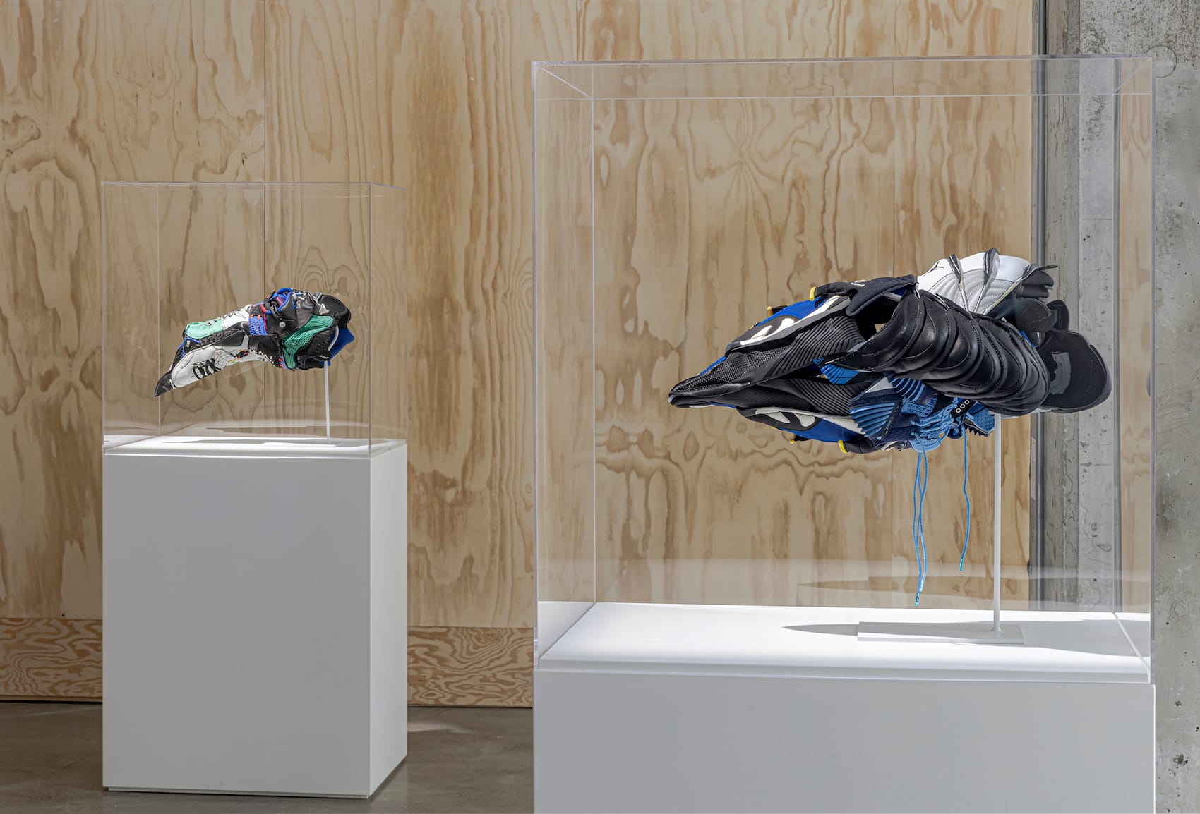 Since the late 1990s, the internationally acclaimed Canadian artist has stretched, layered, and stitched deconstructed Air Jordan sneakers into biomorphic sculptural forms harkening back to traditional Indigenous headdresses and masks. At the biennial's 5 Lower Jarvis exhibition site, two recent works from the ongoing series take on a new form: the 17th-century plague doctor mask. Individually encased in two glass vitrines, the sharp-beaked masks connect the Black Death to COVID-19 and the rampant production and commodification of FFP2 and KF94 masks. They stand out as the rare biennial works to directly contend with the pandemic's collective trauma and grief.