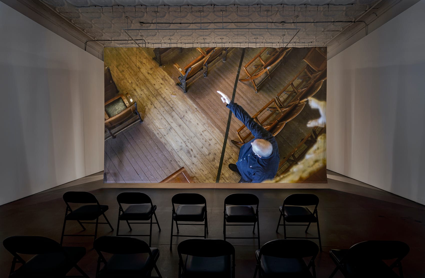 The Turner Prize Winner's film is ostensibly about the Haskell Free Library and Opera House, "the last of the little cracks" straddling the Canada-United States border. Its slow pan of public library interiors becomes a portal into the arbitrariness of and loopholes in national borders. Through monologues delivered by filmmaker Mahdi Fleifel, the film connects the library's unique jurisdiction — it became a site for family reunions during Trump's Muslim Ban — to other contested and far more fatal border zones. Abu Hamdan's first major Canadian commission, 45th Parallel's dramatic theatricality benefits from its solo presentation at Mercer, a contemporary arts space situated within a renovated early 20th-century movie theater in the city’s west end.