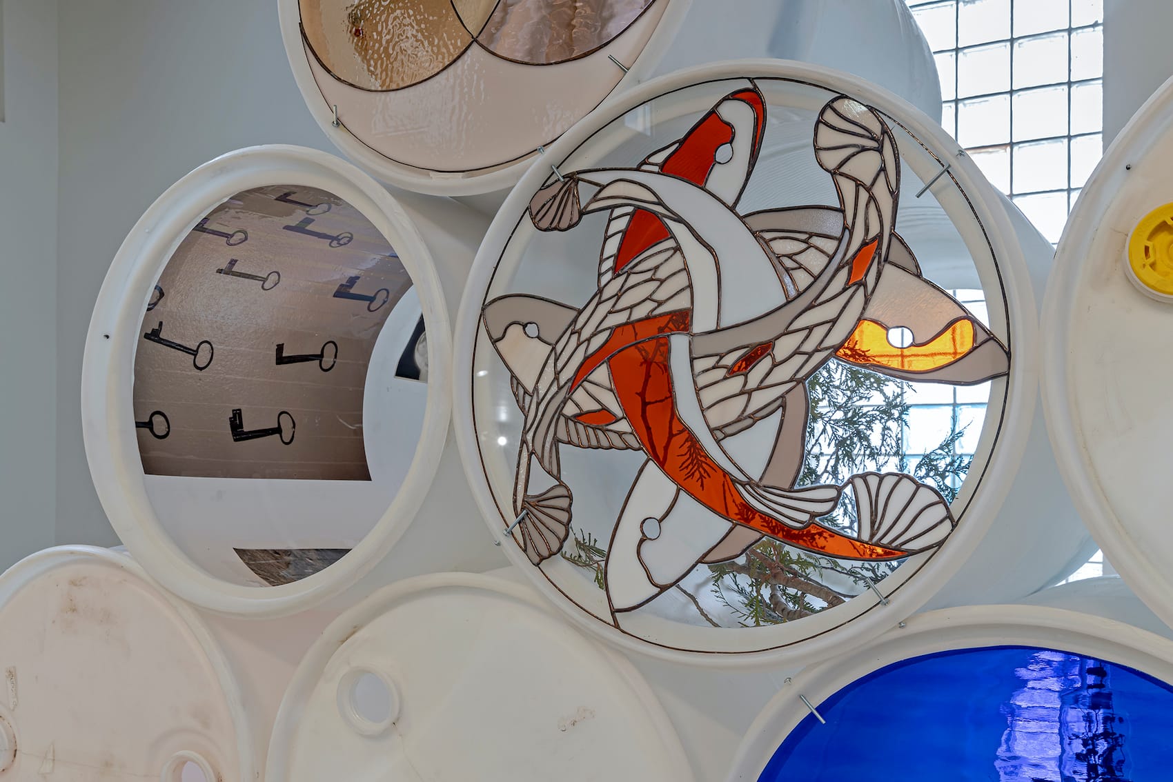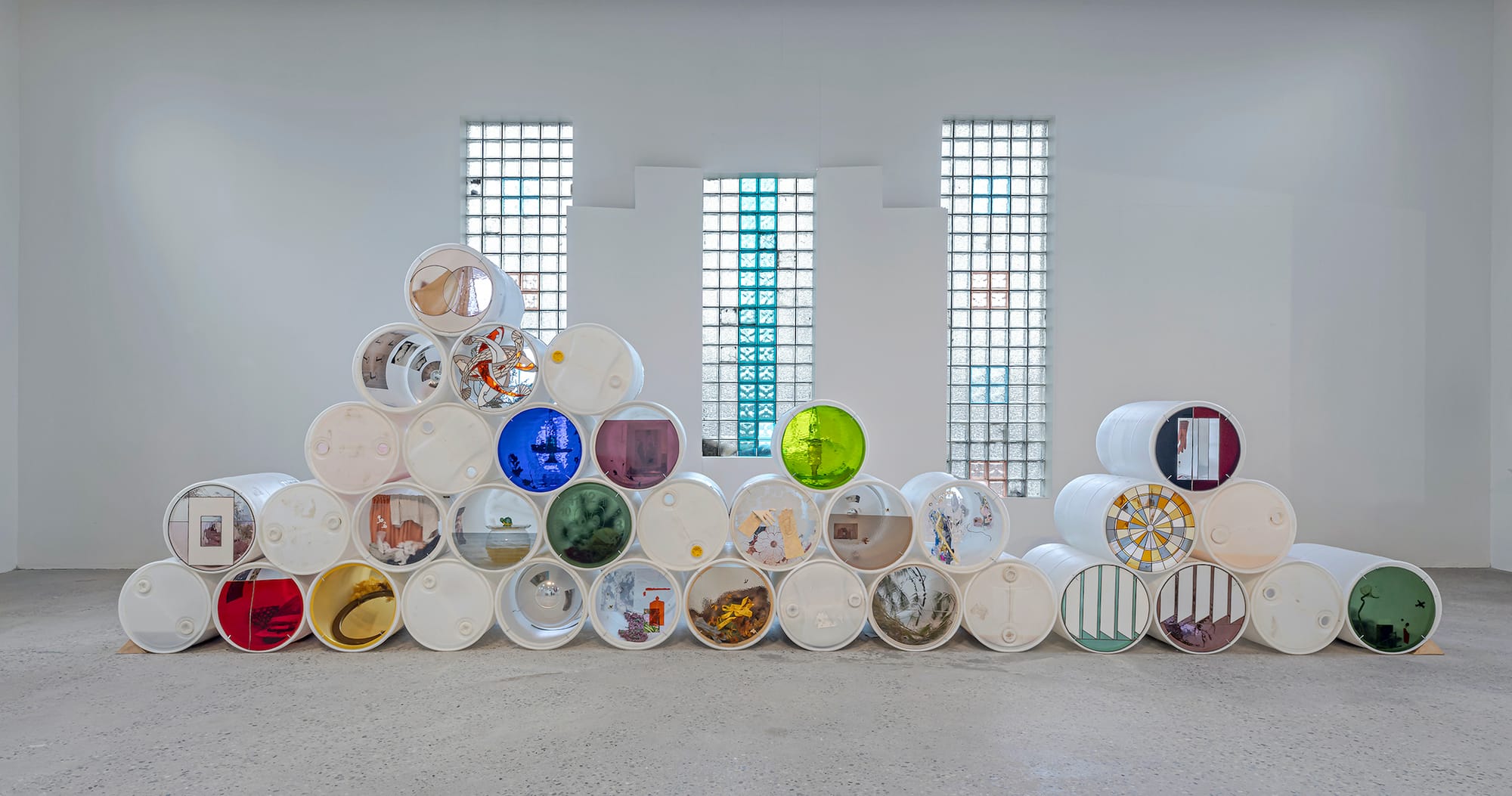 From a distance, the stacked white plastic drums that comprise Belerique’s installation resemble the distinctive rolls of ocean waves. Step closer, and these worn shipping containers, often used by the Toronto artist's family to ship food and gifts to relatives in the Azores, hold assemblages composed of seemingly throwaway personal effects and photographs. The installation, entitled HOLDINGS, offers a peek into the talismanic weight of the objects we carry. Last seen in the New Museum Triennial, Belerique's architectural creation is a bold addition to her body of photo and installation-based work, which traces the connections between image, memory, and personal encounter.