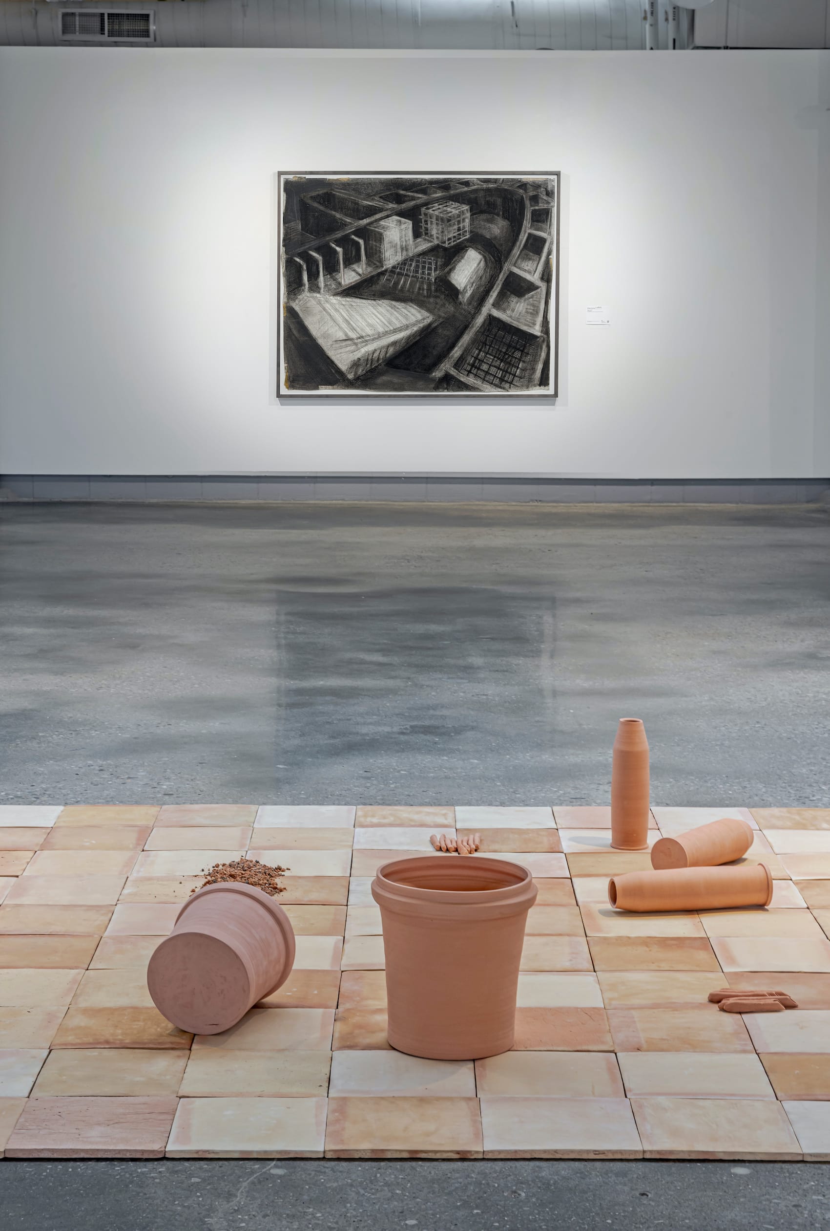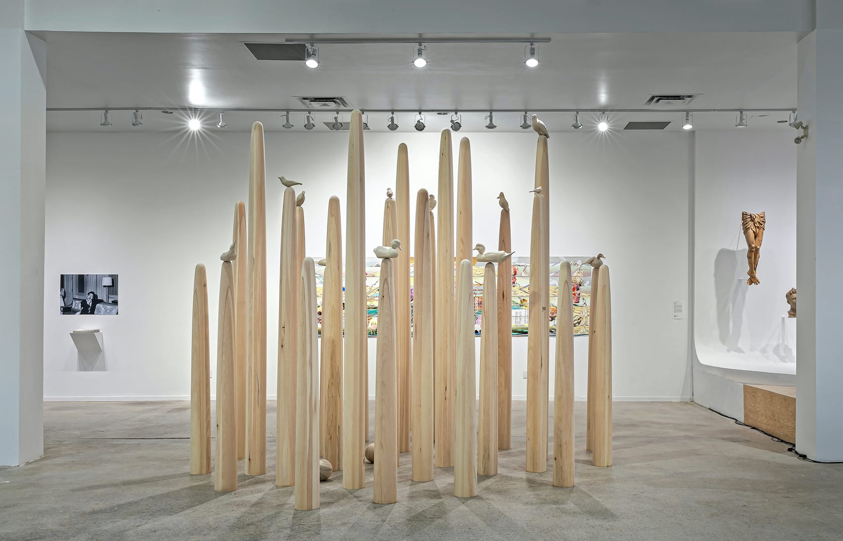 This year, one of the Biennial's main sites is 72 Perth Avenue, a former Pentecostal Church in the city's west end now slated for redevelopment. So it's rather apt that two works from the Chicago-based Ojibwe artist make the most of the church's skylight. The hand-carved wooden beams of "Never-Ending Monument" — co-commissioned by the 2022 Front International — can be traced back to Wisconsin’s “Man Mound,” the only remaining effigy mounds in the United States. Installed in front of Carlson's multi-panel drawing, "Cast a Shadow," these Great Lakes effigies connect with other Biennial works in the ways that they explore the Indigenous and decolonial histories of our waterways.