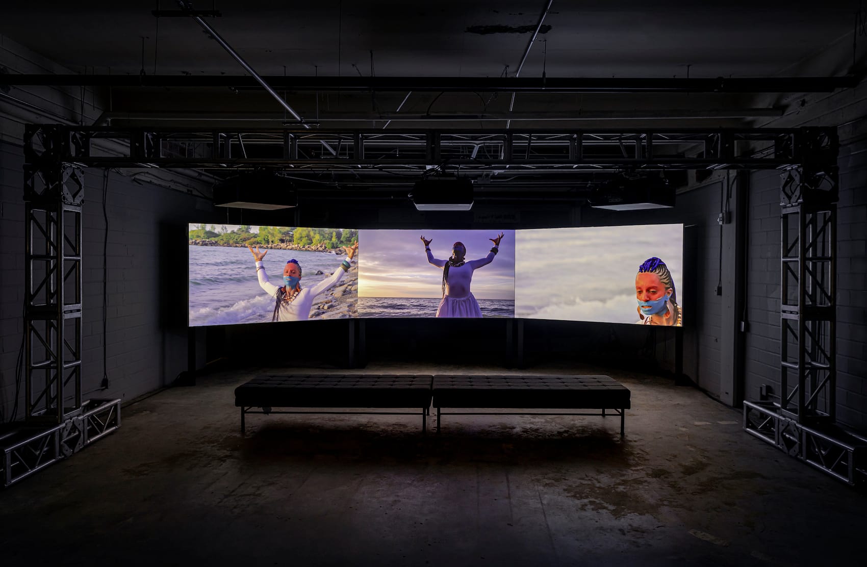 Camille Turner's three-channel projection "Nave" is an assured scaling of the Jamaican-born, Los Angeles-based artist's investigations into Canada's buried slave trade history. Partly filmed in a Toronto church and Newfoundland's rugged cliffs, the immersive installation follows the artist’s longstanding futurist Afronautic Research Lab performance alter-ego, which conjures a Middle Passage ancestor from a church’s nave. Amid a soundscape of propulsive hand drumming and lapping Atlantic waves, the ancestor, face painted red and blue, is Anansi-like in her beach movements; she potentially signifies the human cargo carried in the slave ships built in the province. Like Isaac Julien's WESTERN UNION: Small Boat, this video piece balances the multilayered aesthetics and histories of displacement.