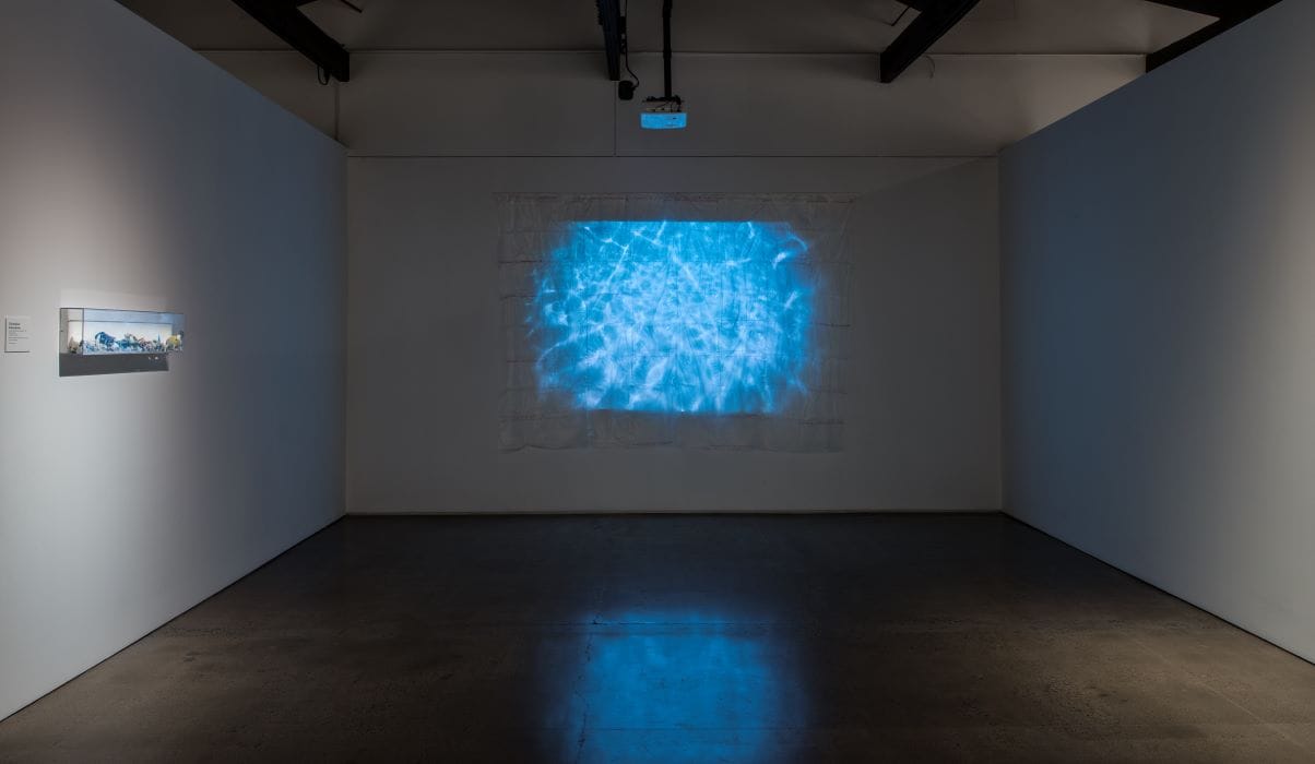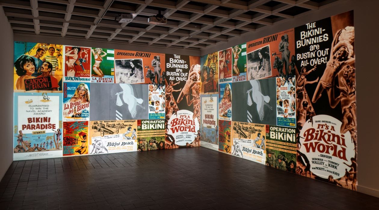 Featured video works are particularly effective at addressing the complex history of surfing and Native Hawaiian culture, including the impacts of colonization and the glaring cultural appropriation evident in the Southern California surfing scene. With her two-screen video installation Bikini and the bikini (2022), Nicole Naone (Kānaka Maoli) examines both the 23 nuclear devices detonated at Bikini Atoll during the mid-20th century and the bikini bathing suit of the same period, elevating themes related to violence, sexism, and commodification.