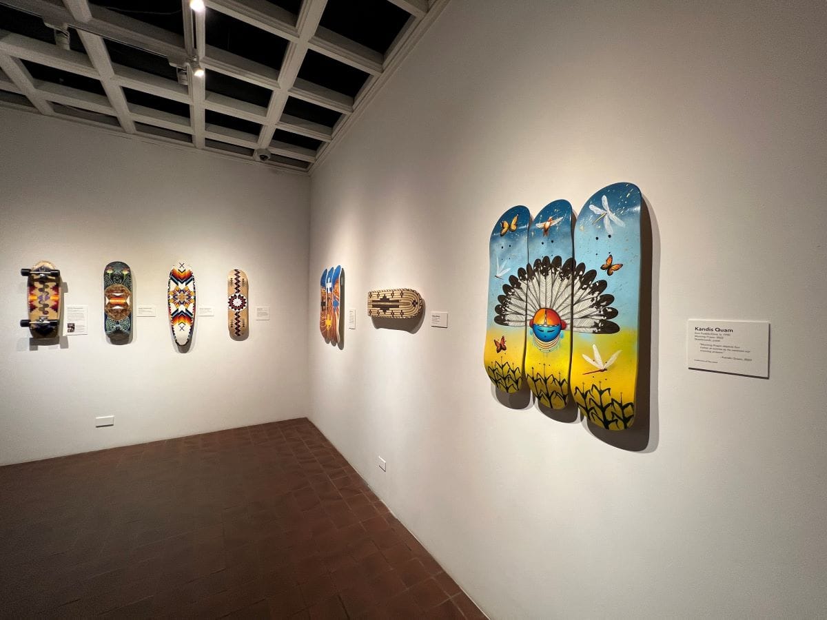 The exhibition also includes skateboard art by seven Indigenous non-Hawaiian artists, which reference the influence of surfing on “sidewalk surfing” and other sports. The decks reflect an intriguing array of symbolism and materiality, and suggest the many intersections of Kānaka Maoli with Indigenous cultures in the Southwest. But they also signal a missed opportunity to further elaborate on those relationships.