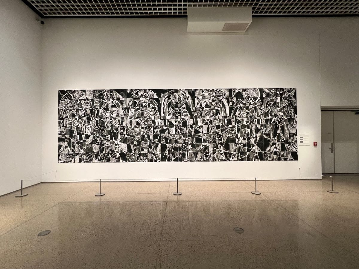 Early on, viewers see Papa He’e Nalu I ka Wā Akua (Surfing in The Time of the Gods) (2022), a striking black-and-white painting by Solomon Robert Nui Enos (Kānaka Maoli), which is rooted in the Hawaiian creation story. Here, akua (gods) set upon surfboards convey the pono (equilibrium) that’s central to the human body and the rest of the natural world. While reflecting the nature of surfing as a spiritual and cultural practice, the work only hints at the role of cosmology in the storytelling traditions of Native Hawaiians.