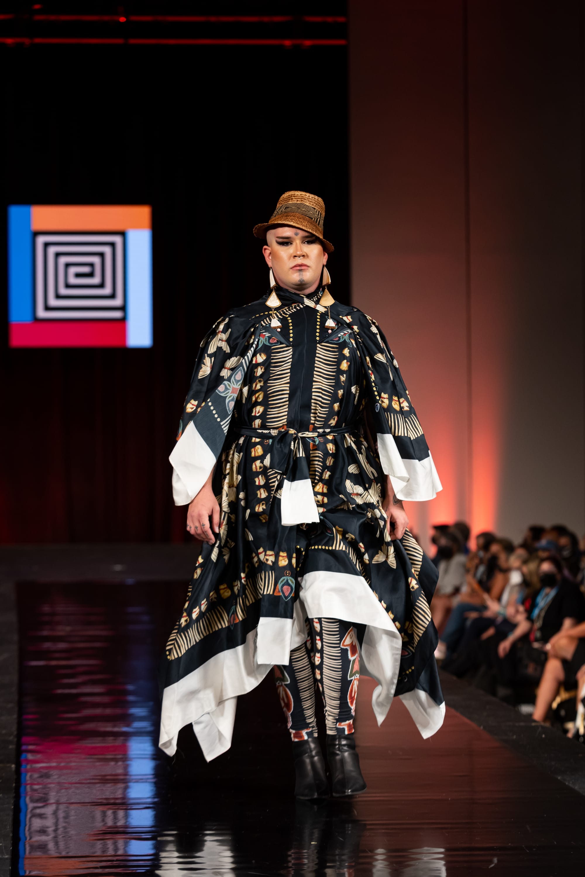 “Then there’s another component to this, which is the artists who really blur that line between art and fashion. They’re bringing the performative element,” said Bear Robe. She calls this circle “the rule-breakers,” and it includes visual-artists-turned-designers Catherine Blackburn, Jason Baerg, and Skawennati. Blackburn’s elaborate beadwork has graced Indian Market’s runway before; her New Age Warriors collection showed in 2019, and became a successful traveling exhibition soon after. This year she’s adding vibrant new designs to the clean silhouettes of collaborating designer Melanie LeBlanc.