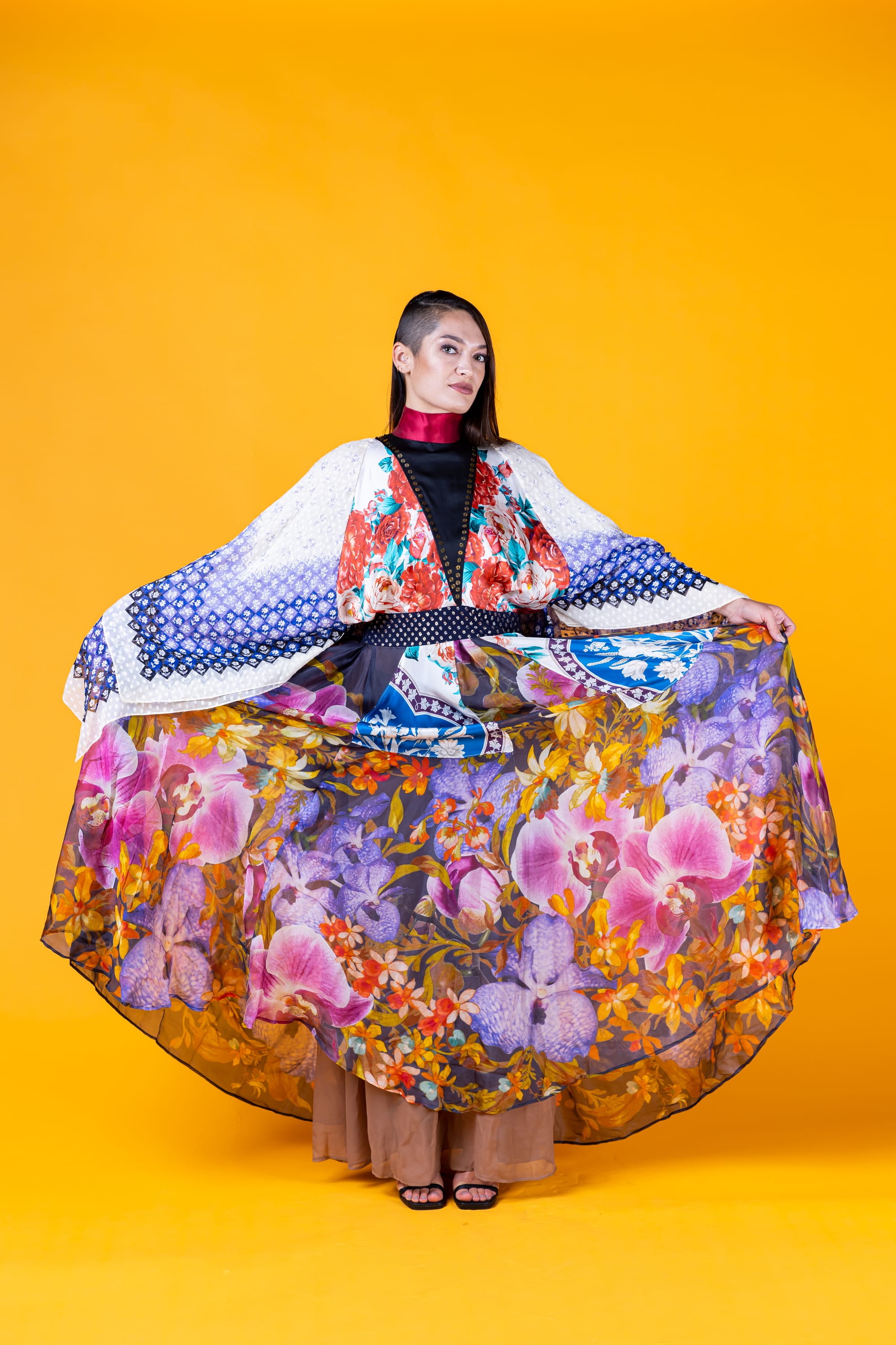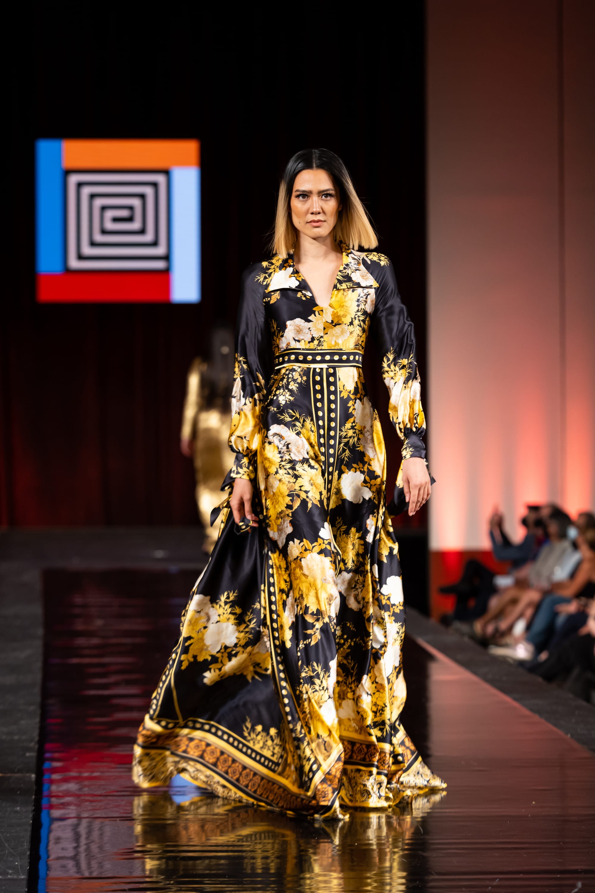 Grant is known for her bold prints that combine Haida Nation motifs with the formline style, and Baker blends First Nations aesthetics from across Canada’s West Coast in her mixed-media fine jewelry. Michaels, who competed on two seasons of Project Runway, hand-dyes and paints sheer fabrics to create haute couture designs with flowing silhouettes.