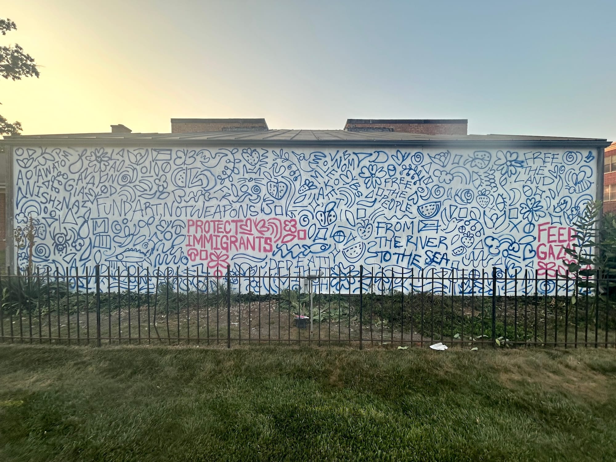 During the work’s installation, John used pro-Palestine phrases and symbols to create the mural’s “doodle grid,” a common mural scaling technique in which an underpainting serves as reference for the final work. These included "Free the Land," "Protect Immigrants," "Fund Art, Not Weapons," "Feed Gaza," and “From the River to the Sea,” as well as images of watermelons, olive branches, and doves. In previous mural commissions, the artist has used similar motifs to create doodle grids, which are then covered up by the finished mural.