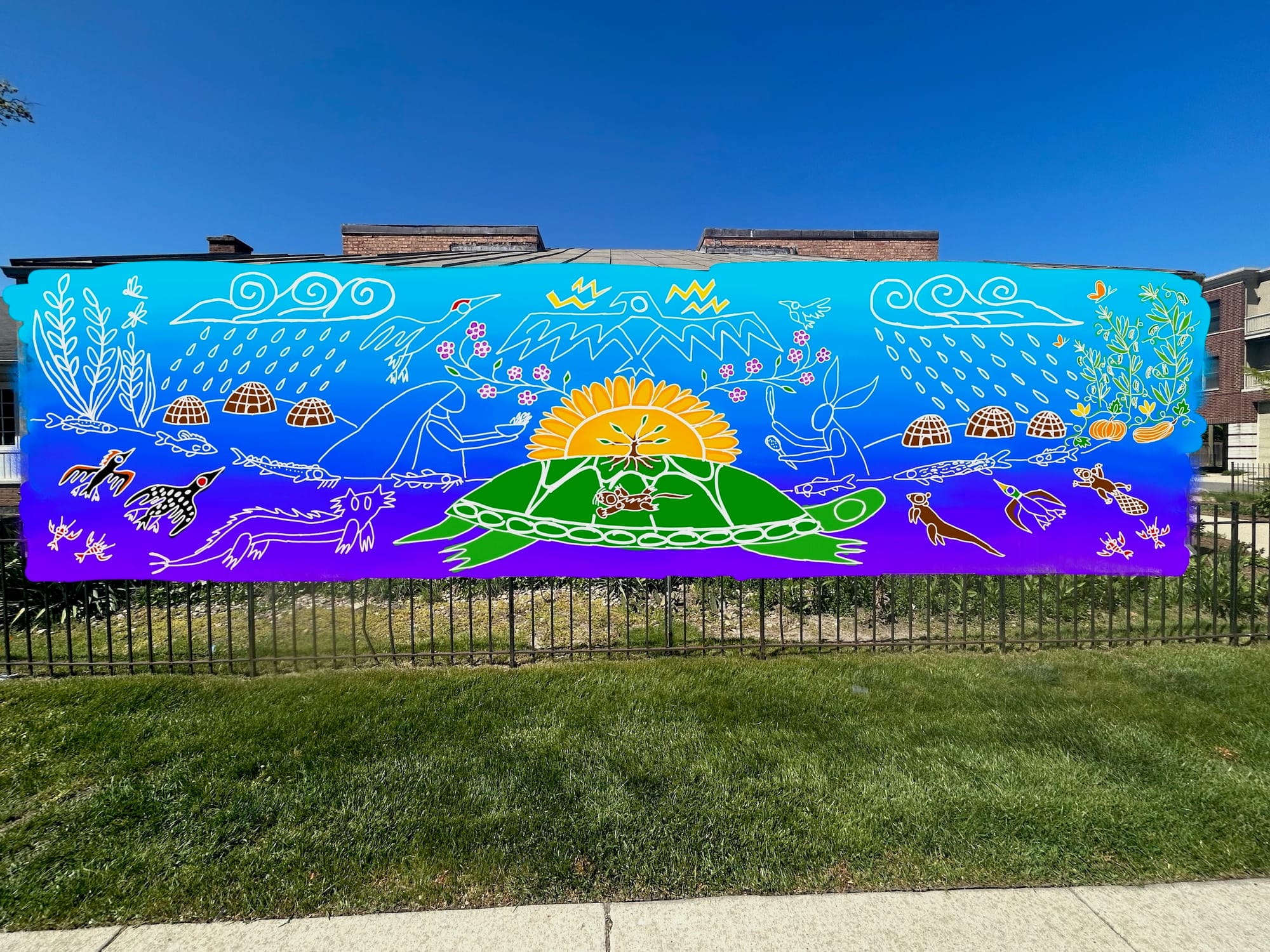 The Gichigamiin Indigenous Nations Museum had commissioned Anishinaabe and Korean-American artist Jamie John to paint an outdoor mural honoring Anishinaabe culture. Finalized and approved in July, the design for the work paid homage to legendary figures such as Sky Woman, the giant turtle and the little muskrat, Thunderbird, and Nanaboozhoo, who play key roles in the Earth’s formation in traditional Anishinaabe creation stories.