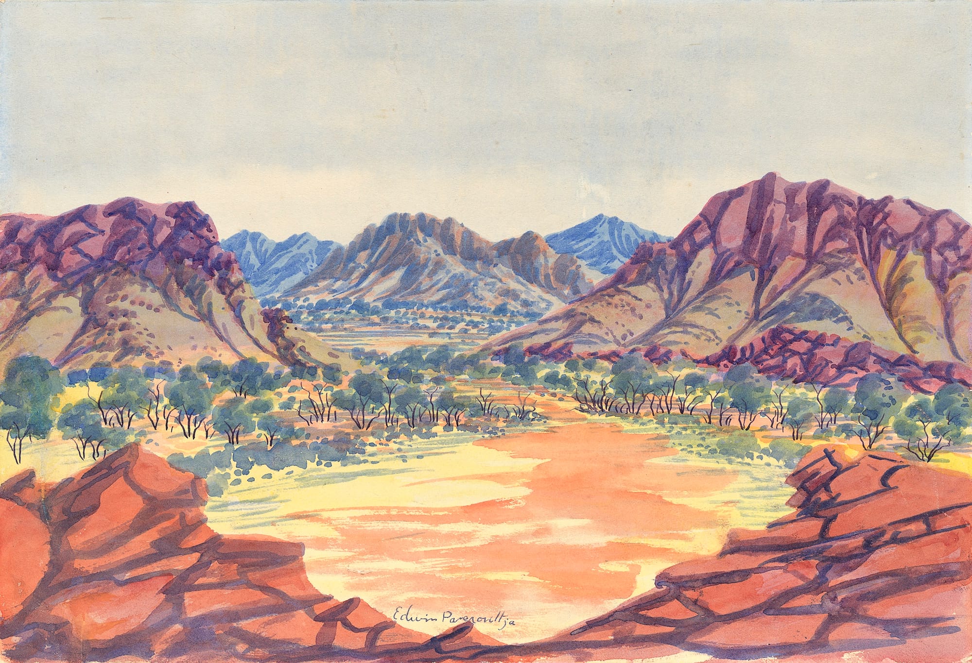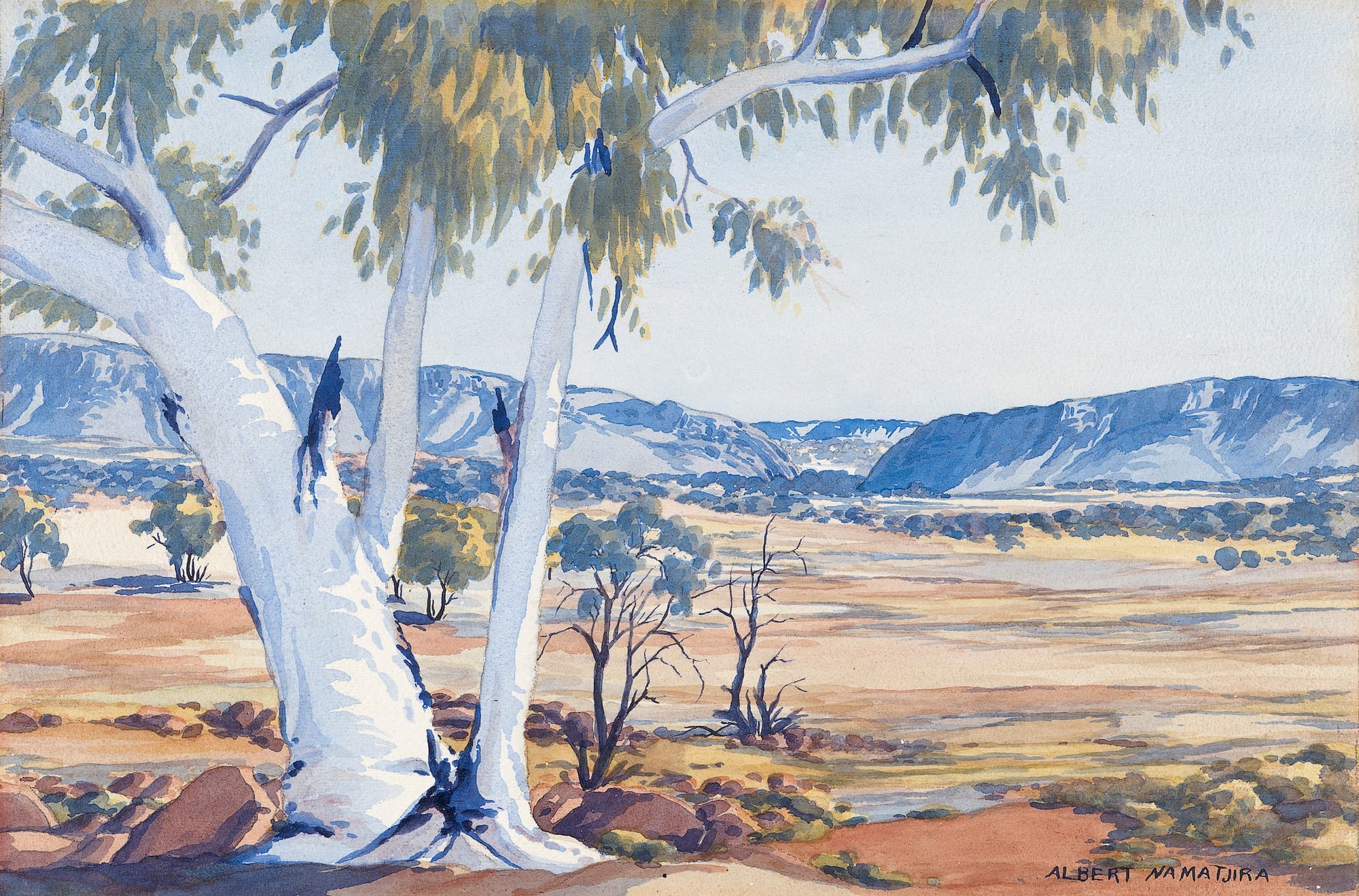 The Hermannsburg School gets its name from a Lutheran mission established in 1877 in Australia’s Northern Territory, close to the Indigenous Aranda community. The movement has its roots in the 1930s, when Rex Battarbee, a visiting artist, met and befriended a young Arrernte man named Albert Namatjira. Over eight weeks in 1936, Battarbee taught Namatjira watercolors in the European landscape style.