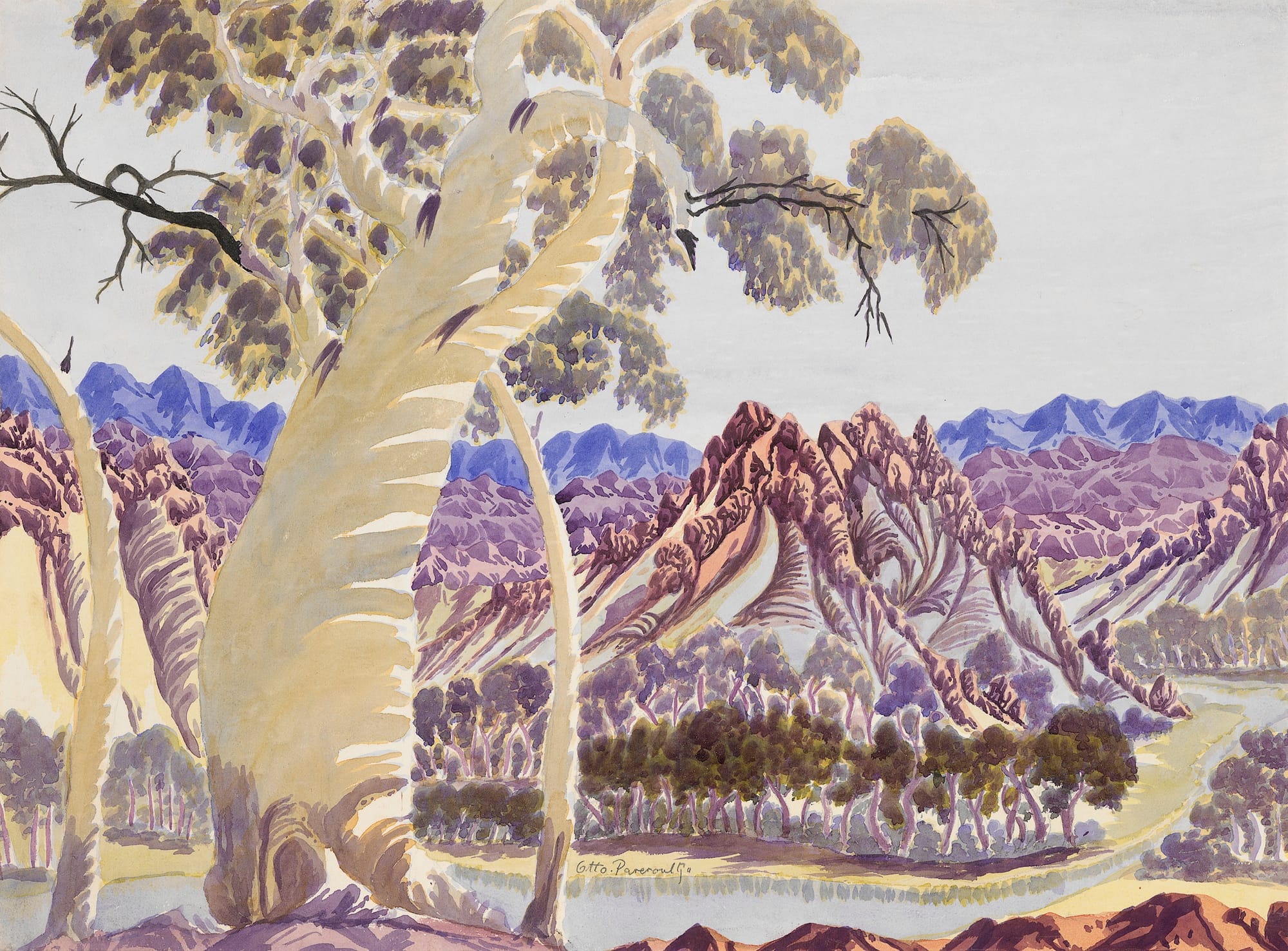 Among the works in Watercolour Country are three of Namatjira’s early paintings: a depiction of a purple and blue Haast Bluff mountain peak in Central Australia from the 1940s, a moody MacDonnell mountain range, and a rendering of the crystalline waters of the Finke River Gorge, the latter two dating to the 1950s. Over 40 other Arrernte, Western Arrernte, and Kemarre/Loritia artists feature in the show. An imposing ghost gum standing before the red James Range is an especially captivating work, painted in 1955 by Otto Pareroultja, a fellow founder of the Hermannsburg School. Also on view are four watercolor landscapes notable for their symmetry and pencil details by Cordula Ebatarinja, one of the only women to have a career as a painter during the movement’s peak during the 1930s to 1950s. Her works are shown alongside pieces by her husband and sons.