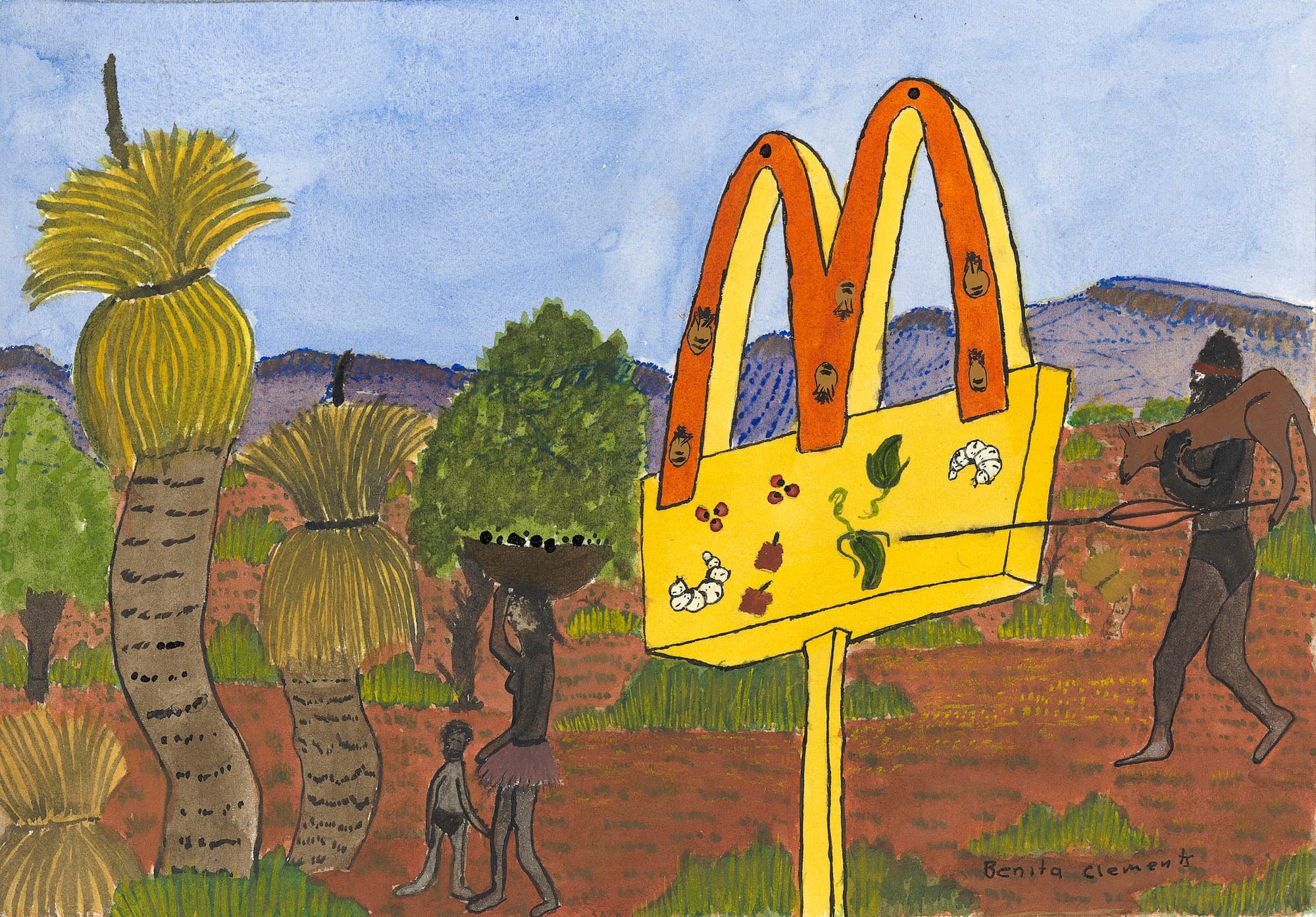 Numerous contemporary artists in the exhibition can trace their ancestry to the school’s founders and continue to practice in its style at the Iltja Ntjarra Many Hands Art Centre. In landscape after landscape, these artists offer a reprieve from the older, romantic landscapes, presenting political messages that often take aim at the lasting impact of empire and colonization. In a 2016 satirical work titled “West McDonalds Ranges,” a send-up taking its name from the MacDonnell mountains, Benita Clements — the great-granddaughter of Albert Namatjira — depicts Aboriginal people using traditional hunting techniques under the food chain’s Golden Arches sign. The work comments on the health risks facing First Nations people while lampooning fast food companies for their profiteering ubiquity. Elsewhere, a colorful, patterned work depicting Mount Gillen overlaid with the words “20 YEAR WAITING LIST” underscores the ongoing disenfranchisement of First Nations people. The artist Lenie Namatjira, Albert Namatjira’s granddaughter, had been waiting 20 years for adequate public housing in the Northern Territory when she created the painting in 2016.