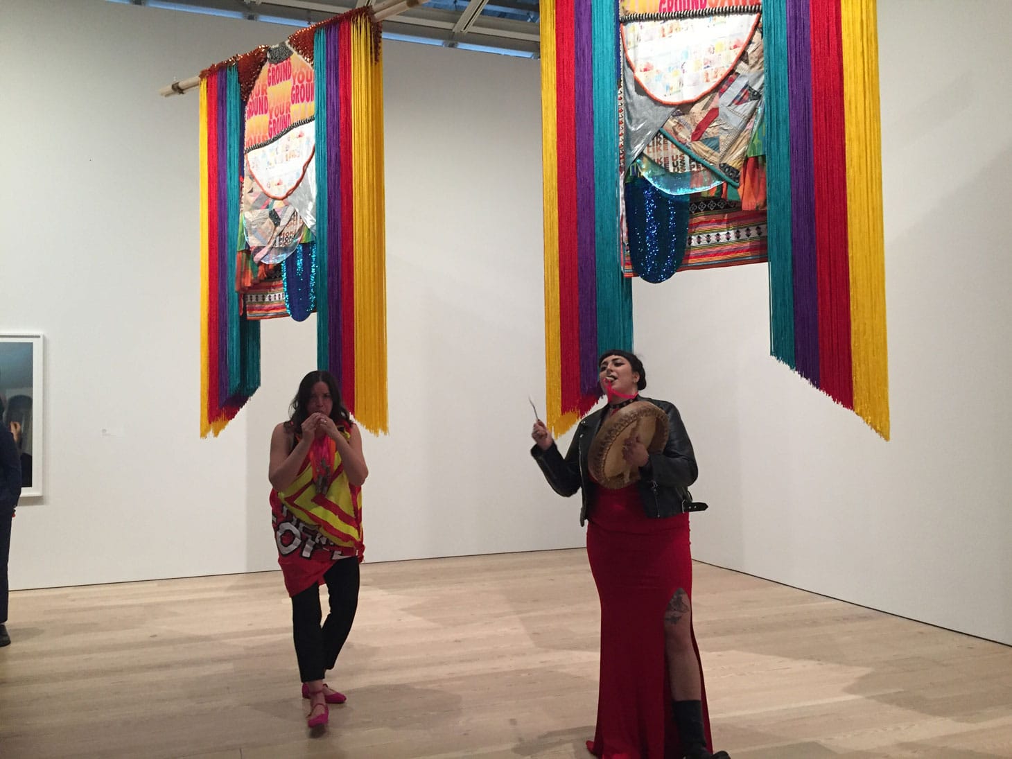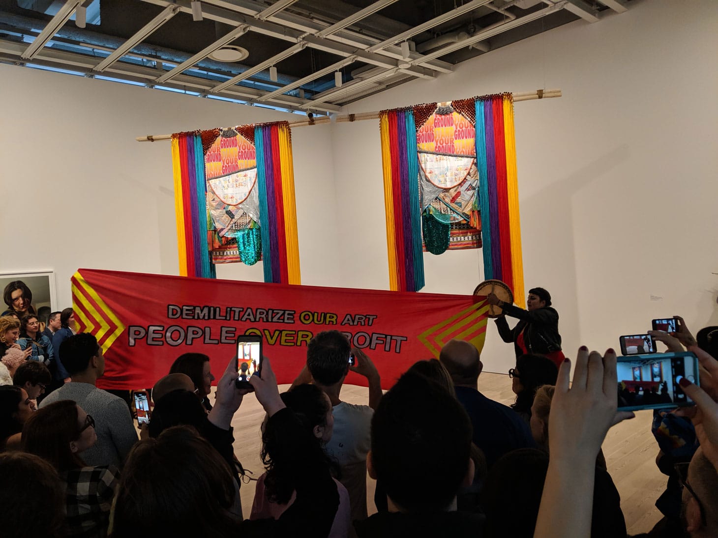Playing antler whistles and a drum underneath the artworks of Jeffrey Gibson, Regan De Loggan and Maria Hupfield unfurled a banner wrapped around Hupfield’s body reading: “DEMILITARIZE OUR ART – PEOPLE OVER PROFIT.”