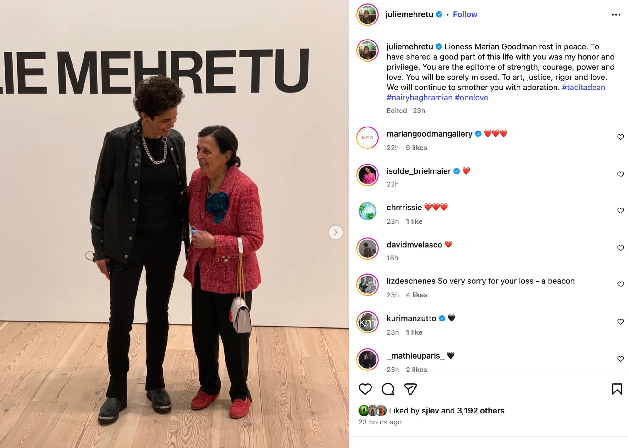 Artists shared heartfelt tributes to Goodman over the weekend, including Mehretu, who called the art dealer a “lioness” in a statement on her Instagram.